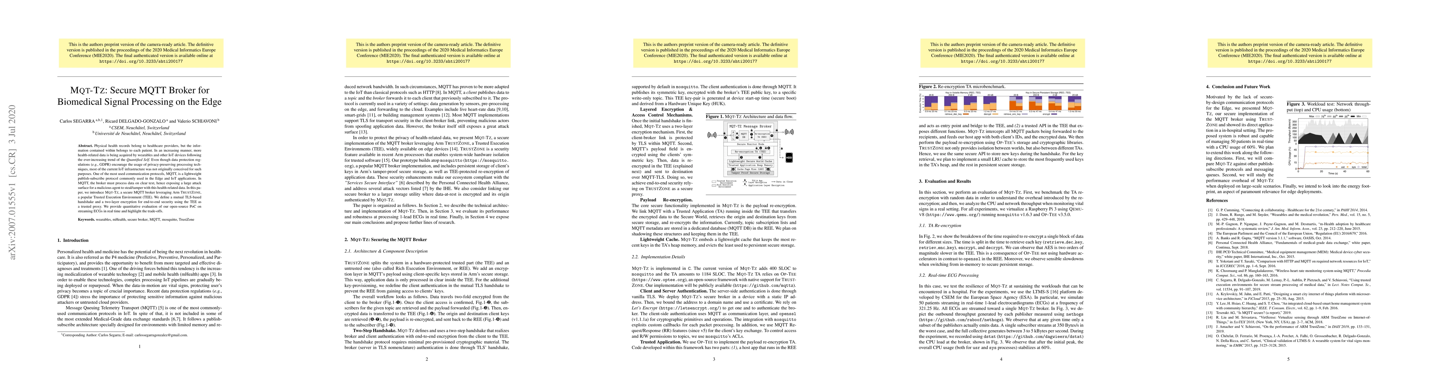 This paper introduces MQT-TZ, a secure MQTT broker for biomedical signal processing on the edge, leveraging Arm TrustZone to protect health-related data. It employs mutual TLS-based handshake and two-layer encryption for end-to-end security, demonstrating its effectiveness through a real-time ECG streaming evaluation.