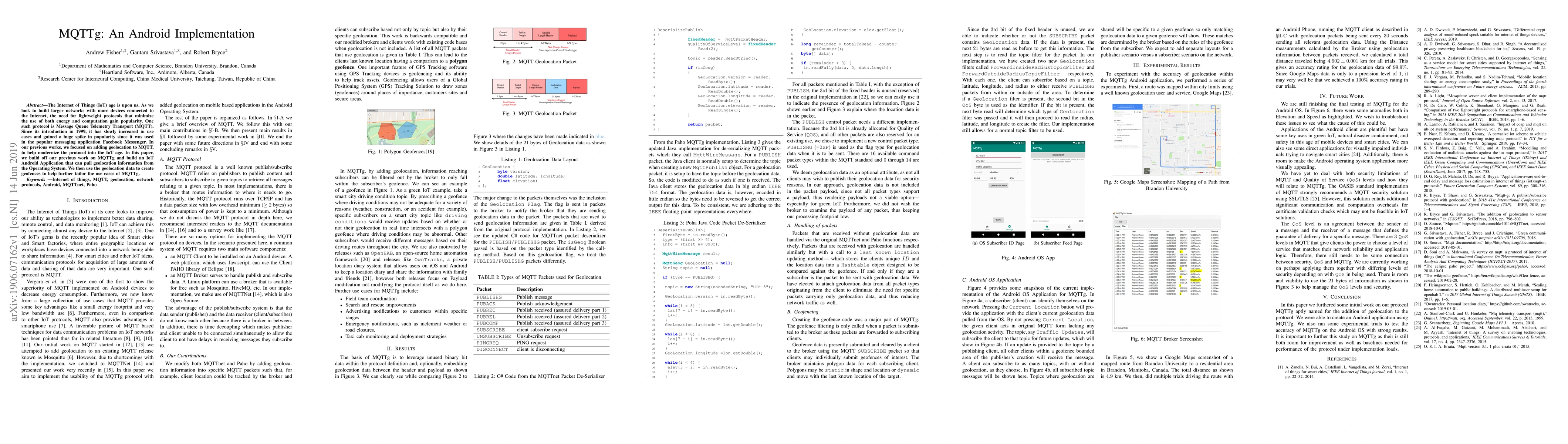 The Internet of Things (IoT) age is upon us. As we look to build larger networks with more devices connected to the Internet, the need for lightweight protocols that minimize the use of both energy and computation gain popularity. One such protocol is Message Queue Telemetry Transport (MQTT). Since its introduction in 1999, it has slowly increased in use cases and gained a huge spike in popularity since it was used in the popular messaging application Facebook Messenger. In our previous works, we focused on adding geolocation to MQTT, to help modernize the protocol into the IoT age. In this paper, we build off our previous work on MQTTg and build an IoT Android Application that can pull geolocation information from the Operating System. We then use the geolocation data to create geofences to help further tailor the use cases of MQTTg.