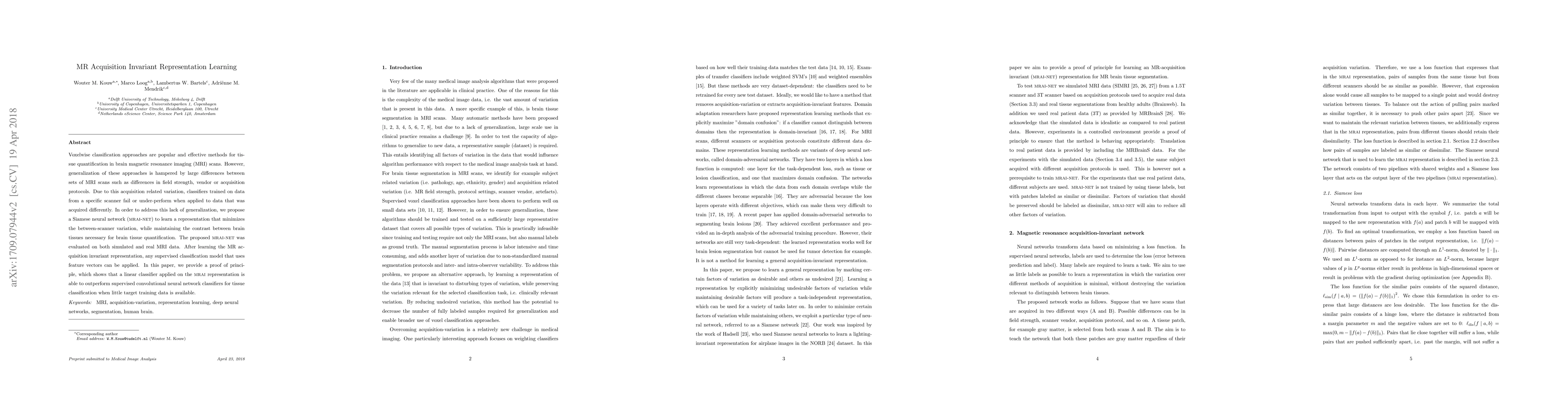 Voxelwise classification approaches are popular and effective methods for tissue quantification in brain magnetic resonance imaging (MRI) scans. However, generalization of these approaches is hampered by large differences between sets of MRI scans such as differences in field strength, vendor or acquisition protocols. Due to this acquisition related variation, classifiers trained on data from a specific scanner fail or under-perform when applied to data that was acquired differently. In order to address this lack of generalization, we propose a Siamese neural network (MRAI-net) to learn a representation that minimizes the between-scanner variation, while maintaining the contrast between brain tissues necessary for brain tissue quantification. The proposed MRAI-net was evaluated on both simulated and real MRI data. After learning the MR acquisition invariant representation, any supervised classification model that uses feature vectors can be applied. In this paper, we provide a proof of principle, which shows that a linear classifier applied on the MRAI representation is able to outperform supervised convolutional neural network classifiers for tissue classification when little target training data is available.