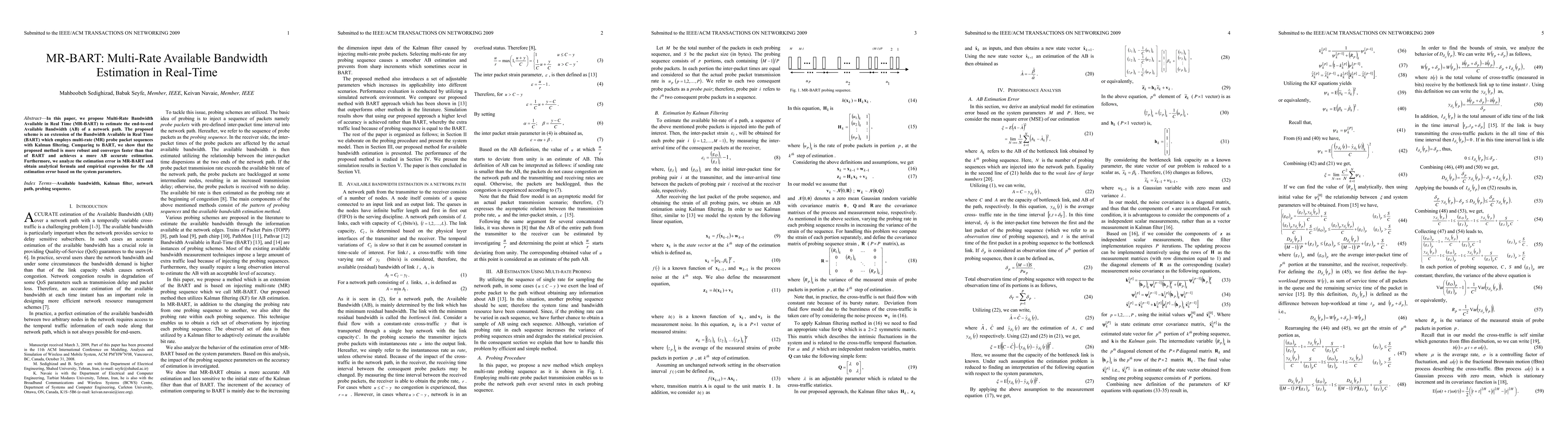 This paper introduces MR-BART, an advanced method for real-time estimation of Available Bandwidth (AB) in network paths, extending the BART approach with multi-rate probe packets and Kalman filtering for enhanced robustness and faster convergence. The study also provides analytical and empirical formulas for AB estimation error based on system parameters.