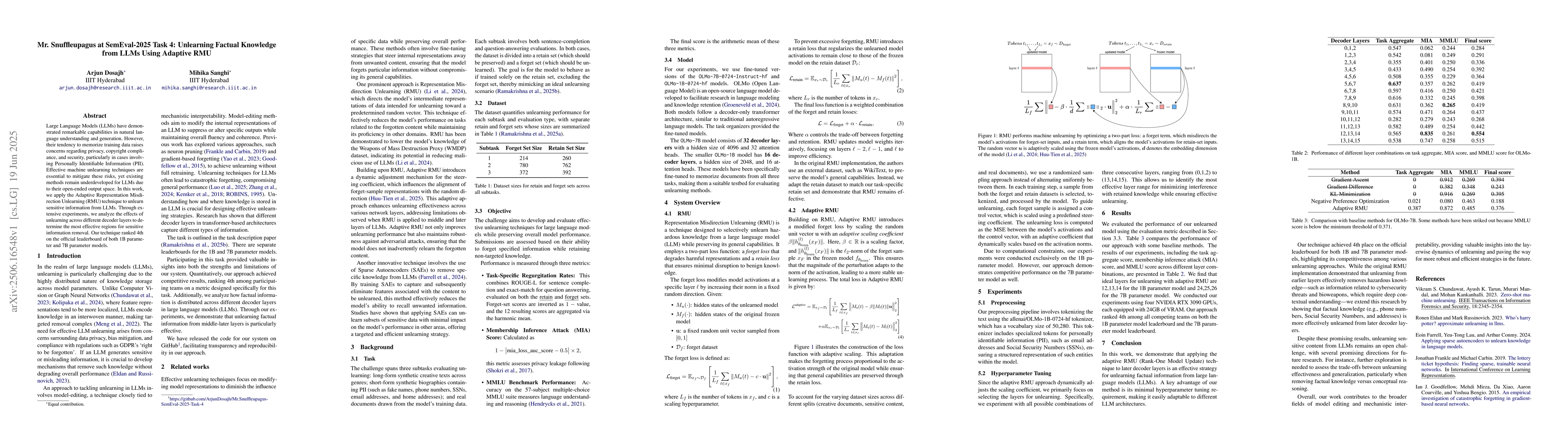 Large Language Models (LLMs) have demonstrated remarkable capabilities in natural language understanding and generation. However, their tendency to memorize training data raises concerns regarding privacy, copyright compliance, and security, particularly in cases involving Personally Identifiable Information (PII). Effective machine unlearning techniques are essential to mitigate these risks, yet existing methods remain underdeveloped for LLMs due to their open-ended output space. In this work, we apply the Adaptive Representation Misdirection Unlearning (RMU) technique to unlearn sensitive information from LLMs. Through extensive experiments, we analyze the effects of unlearning across different decoder layers to determine the most effective regions for sensitive information removal. Our technique ranked 4th on the official leaderboard of both 1B parameter and 7B parameter models.