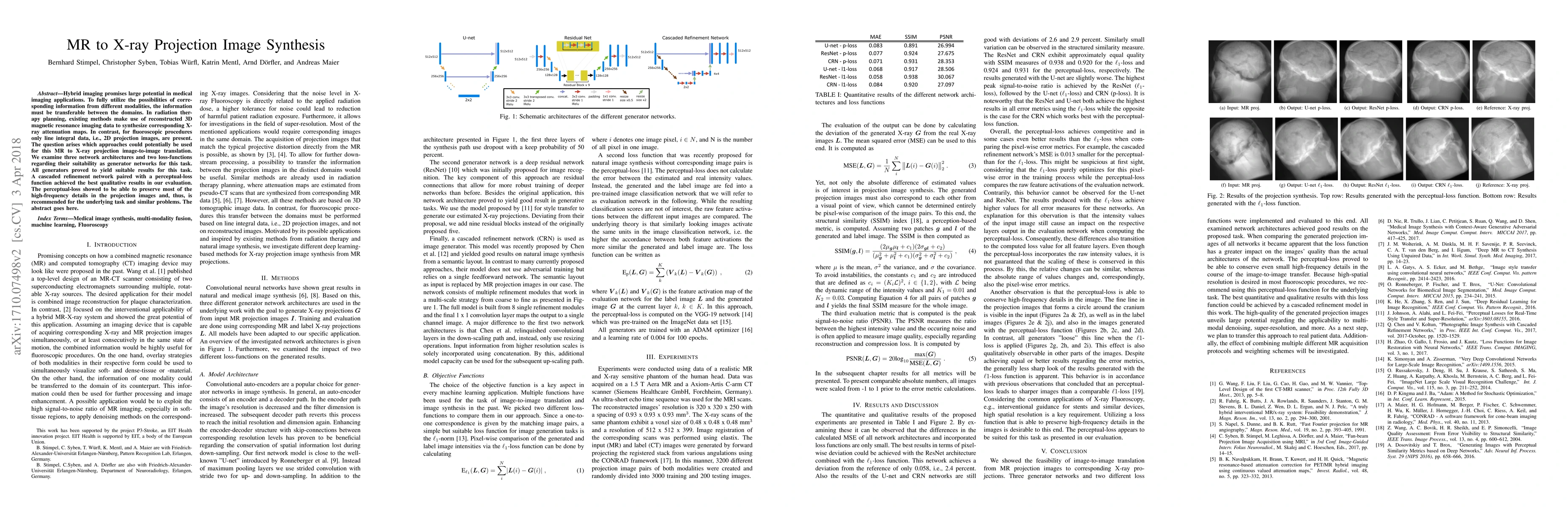 Hybrid imaging promises large potential in medical imaging applications. To fully utilize the possibilities of corresponding information from different modalities, the information must be transferable between the domains. In radiation therapy planning, existing methods make use of reconstructed 3D magnetic resonance imaging data to synthesize corresponding X-ray attenuation maps. In contrast, for fluoroscopic procedures only line integral data, i.e., 2D projection images, are present. The question arises which approaches could potentially be used for this MR to X-ray projection image-to-image translation. We examine three network architectures and two loss-functions regarding their suitability as generator networks for this task. All generators proved to yield suitable results for this task. A cascaded refinement network paired with a perceptual-loss function achieved the best qualitative results in our evaluation. The perceptual-loss showed to be able to preserve most of the high-frequency details in the projection images and, thus, is recommended for the underlying task and similar problems.