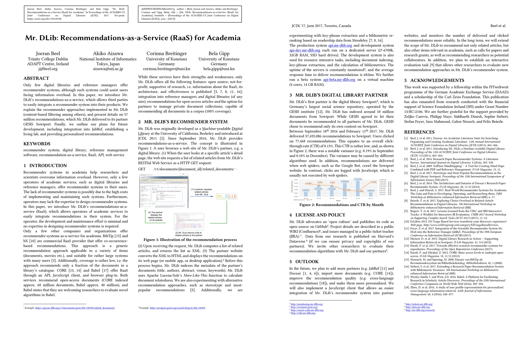 Mr. DLib offers a recommendations-as-a-service (RaaS) to integrate recommender systems into academic products, utilizing content-based filtering among other approaches. The service delivered 57 million recommendations to GESIS Sowiport, with future plans including integration with JabRef and personalized recommendations.