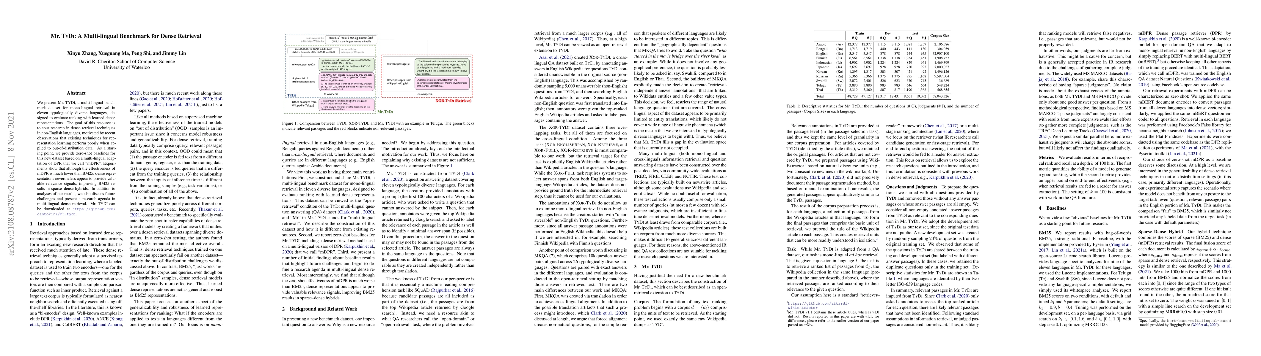 Mr. TyDi is a new multi-lingual benchmark dataset for dense retrieval in eleven diverse languages, aiming to advance research in non-English dense retrieval techniques. Initial experiments with a multi-lingual adaptation of DPR show potential for dense representations to enhance traditional retrieval methods.