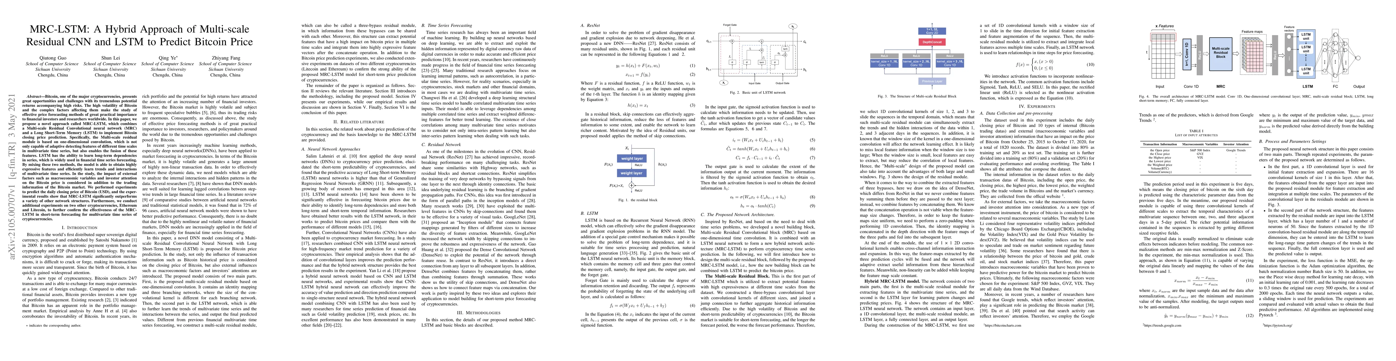 MRC-LSTM combines a Multi-scale Residual Convolutional Neural Network (MRC) with Long Short-Term Memory (LSTM) to predict Bitcoin prices, leveraging both short-term and long-term dependencies. The model outperforms other structures in forecasting Bitcoin, Ethereum, and Litecoin prices, highlighting its effectiveness for cryptocurrency time series prediction.