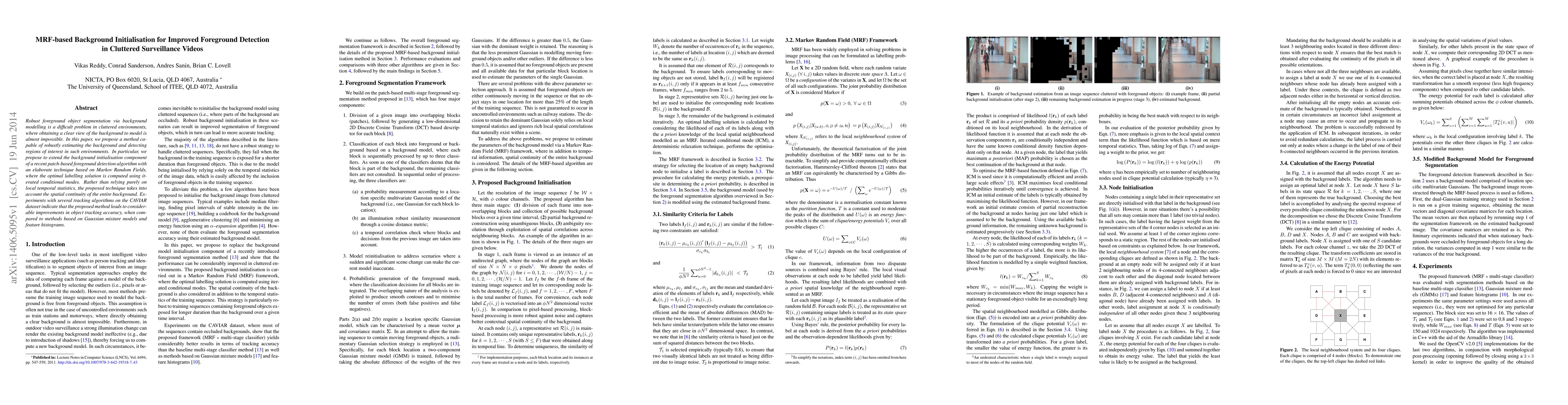Robust foreground object segmentation via background modelling is a difficult problem in cluttered environments, where obtaining a clear view of the background to model is almost impossible. In this paper, we propose a method capable of robustly estimating the background and detecting regions of interest in such environments. In particular, we propose to extend the background initialisation component of a recent patch-based foreground detection algorithm with an elaborate technique based on Markov Random Fields, where the optimal labelling solution is computed using iterated conditional modes. Rather than relying purely on local temporal statistics, the proposed technique takes into account the spatial continuity of the entire background. Experiments with several tracking algorithms on the CAVIAR dataset indicate that the proposed method leads to considerable improvements in object tracking accuracy, when compared to methods based on Gaussian mixture models and feature histograms.