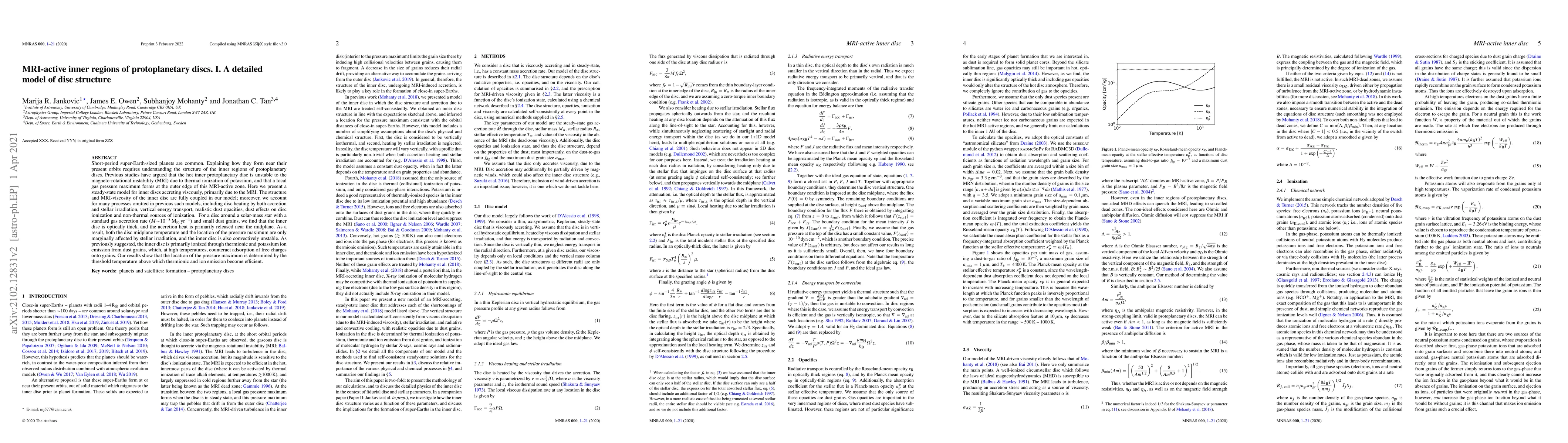 This paper presents a detailed model of the inner regions of protoplanetary discs, focusing on the structure and magneto-rotational instability (MRI)-driven accretion. The model accounts for various heating processes, dust effects, and ionization mechanisms, revealing that the inner disc is optically thick and convectively unstable, with the pressure maximum location determined by the threshold temperature for efficient thermionic and potassium ion emission from dust grains.