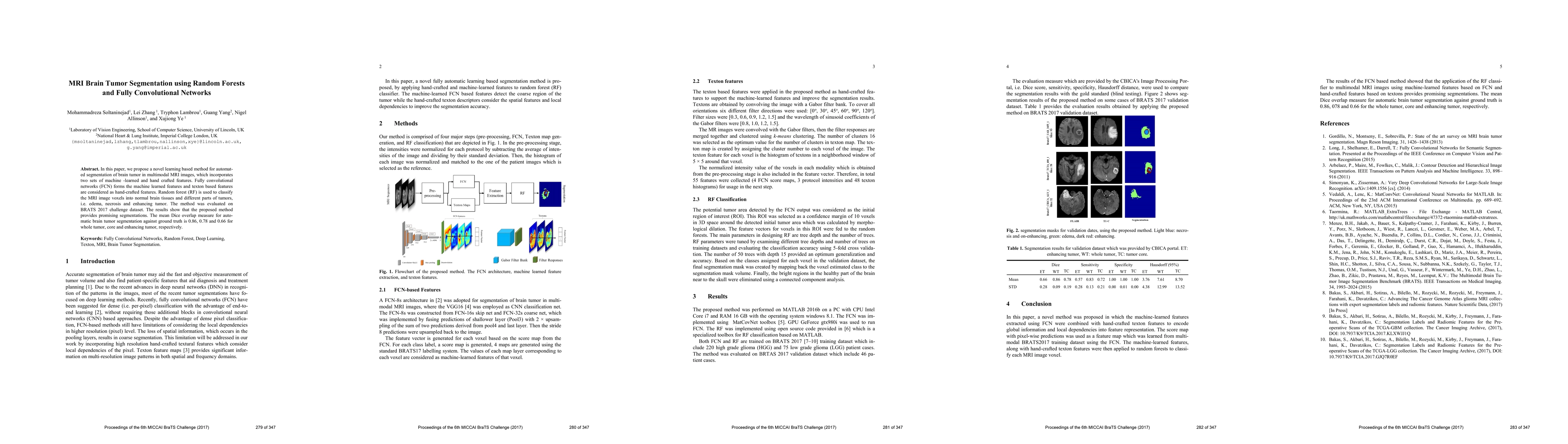 This paper presents an automated brain tumor segmentation method using a combination of fully convolutional networks and random forests, achieving promising results with Dice overlap measures of 0.86, 0.78, and 0.66 for whole, core, and enhancing tumors respectively, evaluated on the BRATS 2017 dataset.