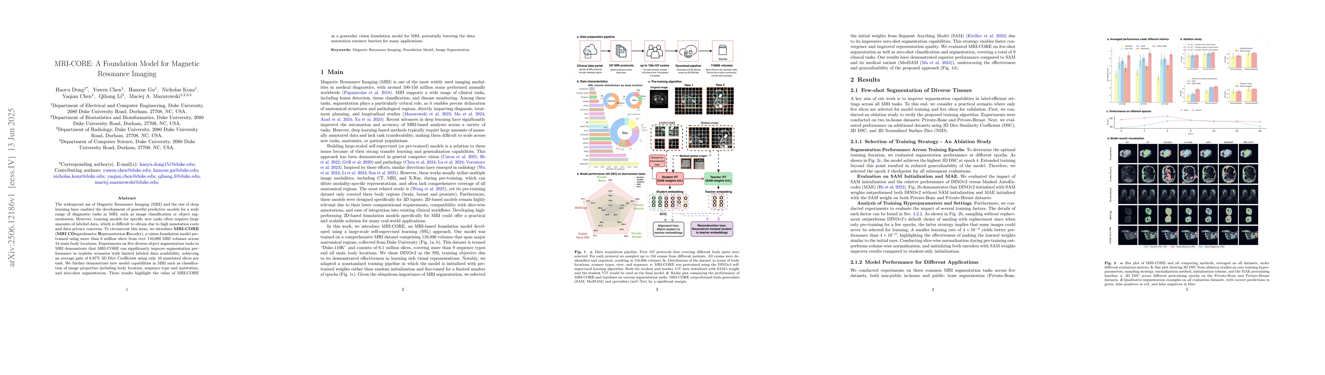 The paper introduces MRI-CORE, a foundation model pre-trained on over 6 million MRI slices from 110,000 volumes. MRI-CORE significantly improves segmentation performance in MRI tasks with limited data, offering an average 6.97% 3D Dice Coefficient gain using just 10 annotated slices per task. It also demonstrates new MRI-related capabilities like classifying image properties and zero-shot segmentation, potentially reducing annotation barriers for various MRI applications.
