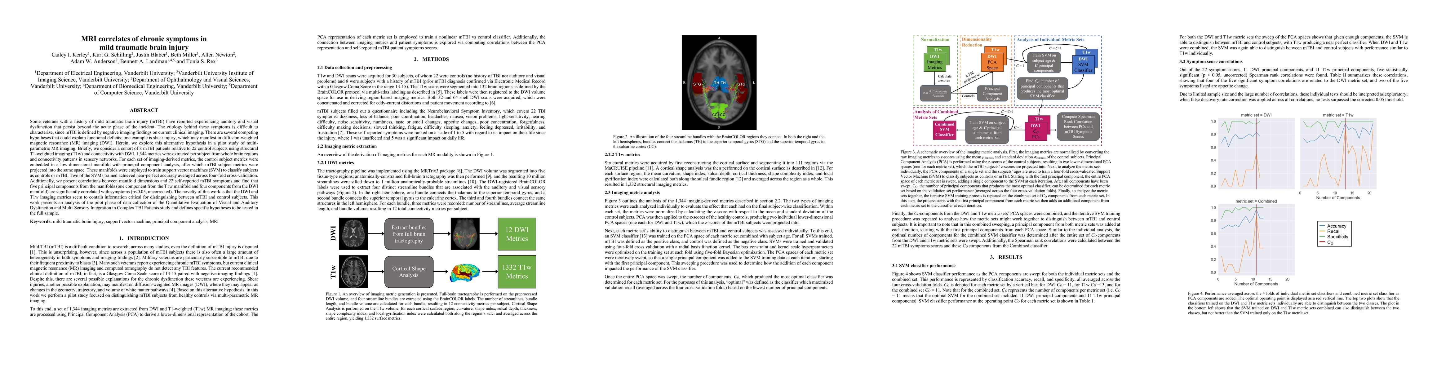 This study investigates the MRI correlates of chronic symptoms in veterans with mild traumatic brain injury (mTBI), using multi-parametric MRI to detect shear injury or micro-bleeds. The research identifies correlations between imaging metrics and persistent auditory and visual dysfunctions, suggesting a link between specific imaging findings and patient symptoms.