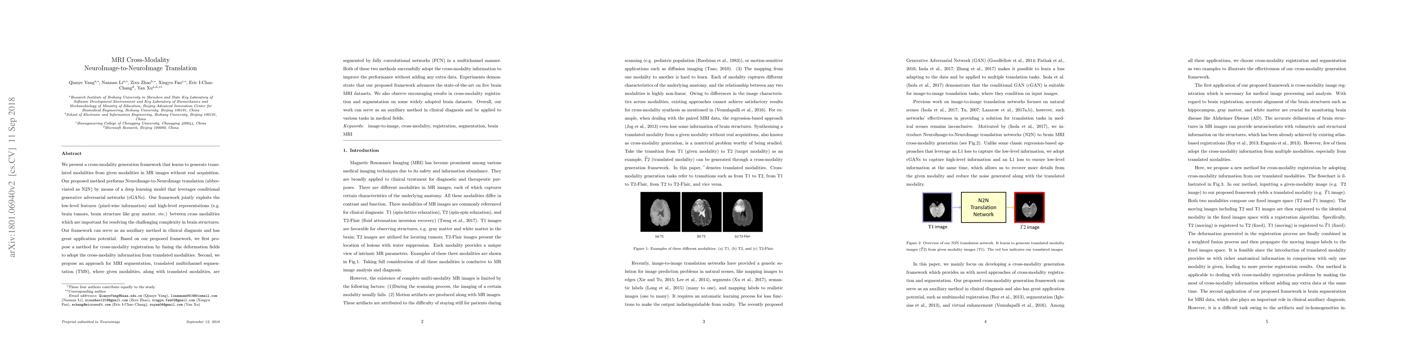 This paper introduces a deep learning framework for NeuroImage-to-NeuroImage translation using conditional GANs to generate translated modalities from MR images without requiring real acquisitions. The proposed methods for cross-modality registration and translated multichannel segmentation improve clinical diagnosis without additional data, demonstrating state-of-the-art performance on multiple brain MRI datasets.