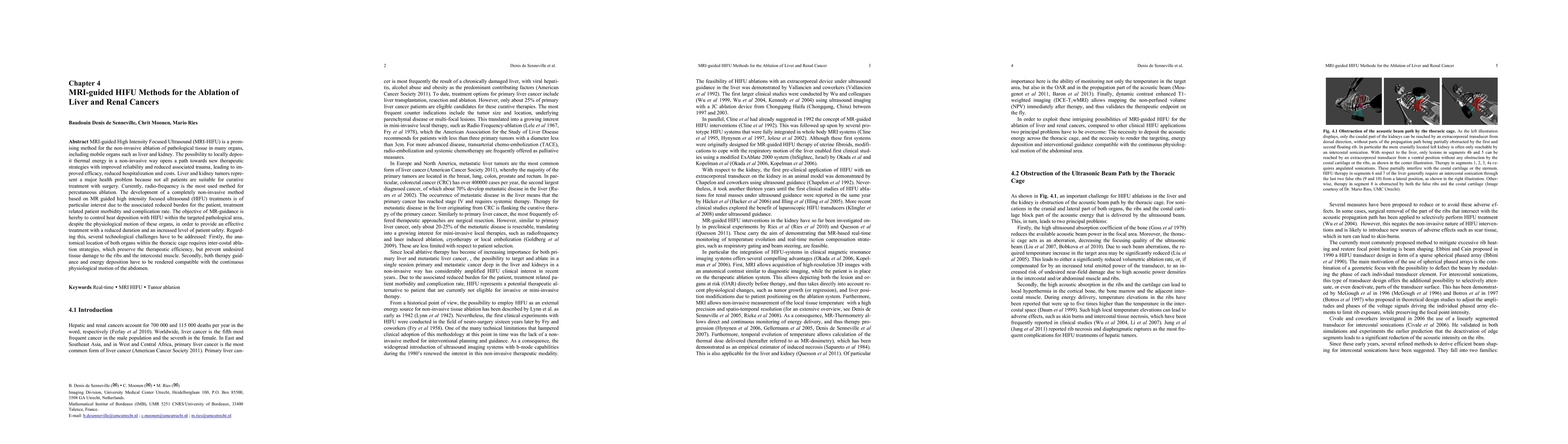 MRI-guided High Intensity Focused Ultrasound (MRI-HIFU) is a promising method for the non-invasive ablation of pathological tissue in many organs, including mobile organs such as liver and kidney. The possibility to locally deposit thermal energy in a non-invasive way opens a path towards new therapeutic strategies with improved reliability and reduced associated trauma, leading to improved efficacy, reduced hospitalization and costs. Liver and kidney tumors represent a major health problem because not all patients are suitable for curative treatment with surgery. Currently, radio-frequency is the most used method for percutaneous ablation. The development of a completely non-invasive method based on MR guided high intensity focused ultrasound (HIFU) treatments is of particular interest due to the associated reduced burden for the patient, treatment related patient morbidity and complication rate. The objective of MR-guidance is hereby to control heat deposition with HIFU within the targeted pathological area, despite the physiological motion of these organs, in order to provide an effective treatment with a reduced duration and an increased level of patient safety. Regarding this, several technological challenges have to be addressed: Firstly, the anatomical location of both organs within the thoracic cage requires inter-costal ablation strategies, which preserve the therapeutic efficiency, but prevent undesired tissue damage to the ribs and the intercostal muscle. Secondly, both therapy guidance and energy deposition have to be rendered compatible with the continuous physiological motion of the abdomen.