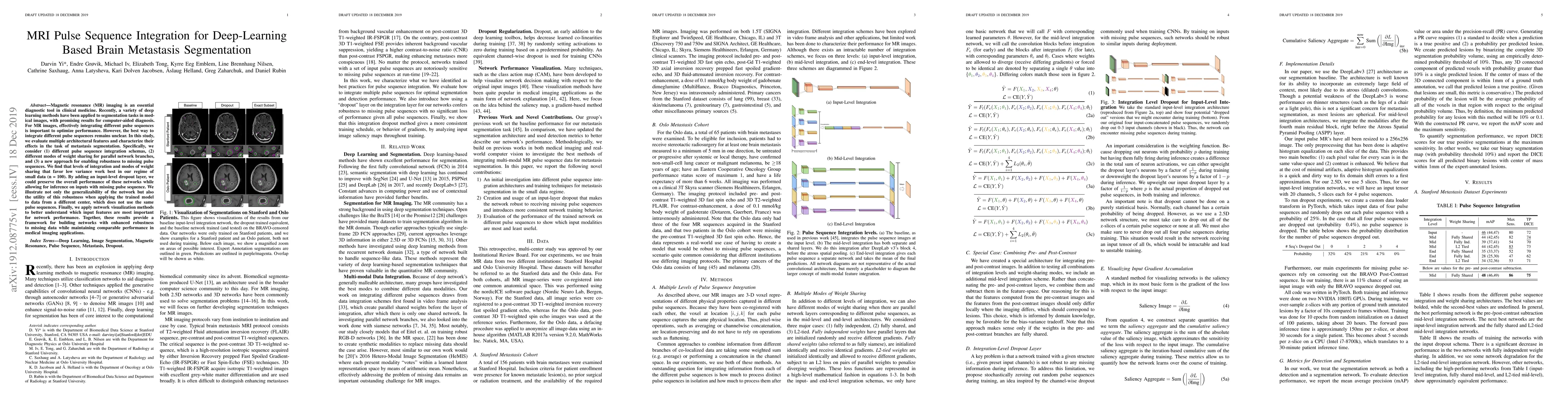 Magnetic resonance (MR) imaging is an essential diagnostic tool in clinical medicine. Recently, a variety of deep learning methods have been applied to segmentation tasks in medical images, with promising results for computer-aided diagnosis. For MR images, effectively integrating different pulse sequences is important to optimize performance. However, the best way to integrate different pulse sequences remains unclear. In this study, we evaluate multiple architectural features and characterize their effects in the task of metastasis segmentation. Specifically, we consider (1) different pulse sequence integration schemas, (2) different modes of weight sharing for parallel network branches, and (3) a new approach for enabling robustness to missing pulse sequences. We find that levels of integration and modes of weight sharing that favor low variance work best in our regime of small data (n = 100). By adding an input-level dropout layer, we could preserve the overall performance of these networks while allowing for inference on inputs with missing pulse sequence. We illustrate not only the generalizability of the network but also the utility of this robustness when applying the trained model to data from a different center, which does not use the same pulse sequences. Finally, we apply network visualization methods to better understand which input features are most important for network performance. Together, these results provide a framework for building networks with enhanced robustness to missing data while maintaining comparable performance in medical imaging applications.