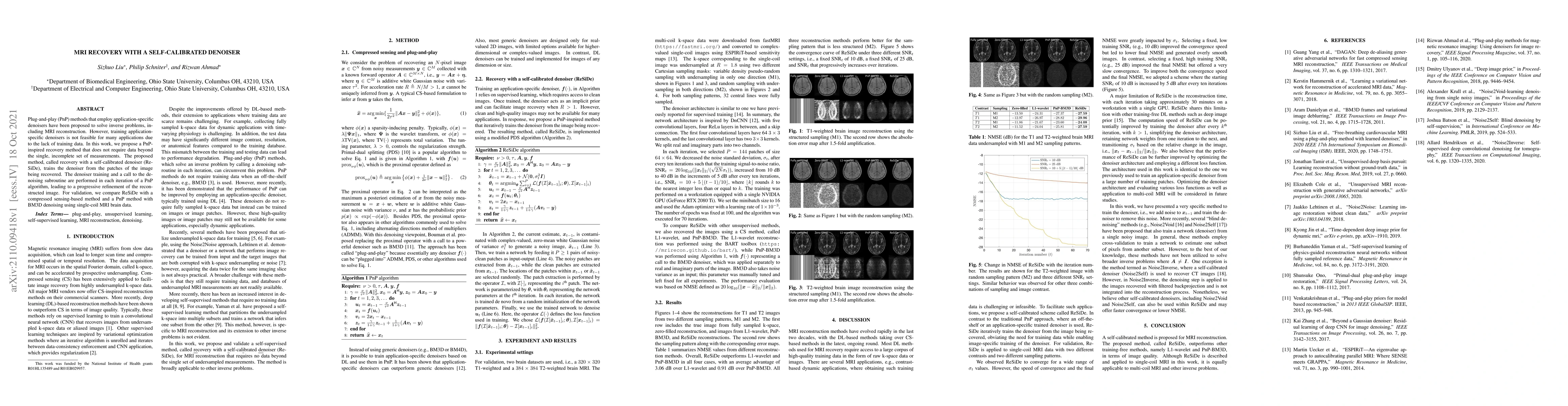 This paper proposes a self-calibrated denoiser (ReSiDe) for MRI recovery that trains its denoiser from the image patches being reconstructed, eliminating the need for training data. The method integrates denoising into each iteration of a plug-and-play algorithm, progressively refining the image, and is validated against compressed sensing and BM3D-based methods using MRI brain data.