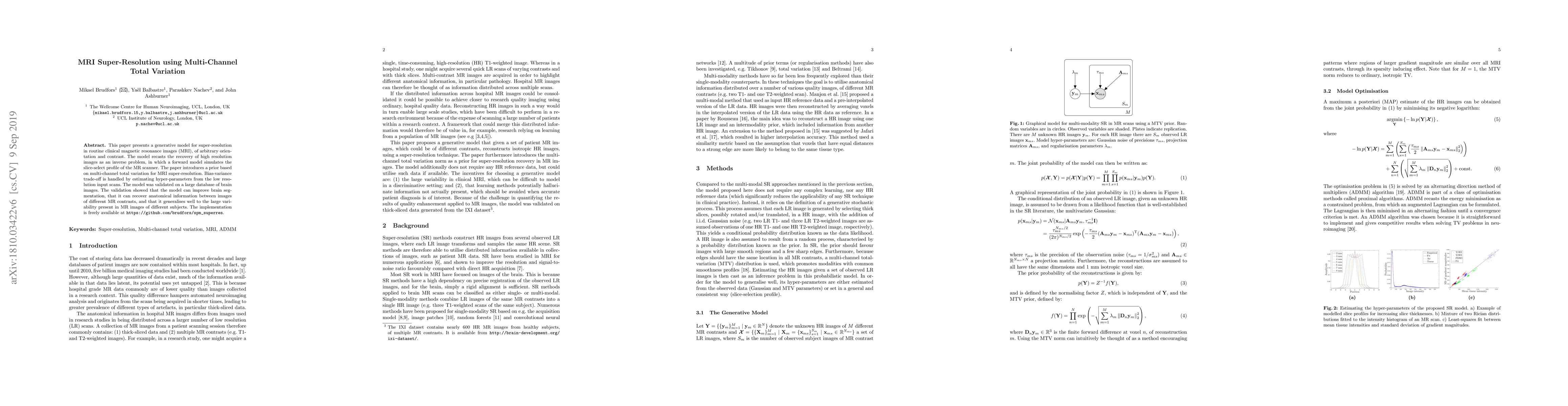 This paper proposes a generative model for MRI super-resolution using multi-channel total variation, which improves brain segmentation and recovers anatomical details across different MR contrasts. The model's effectiveness and generalizability were validated on a large brain image database.