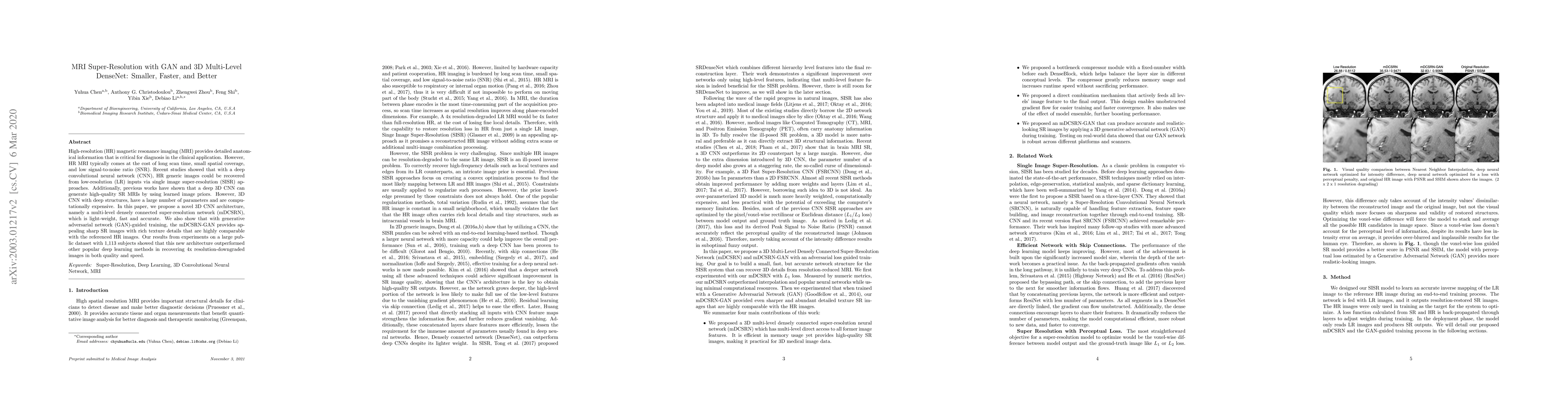 This research paper proposes a novel 3D multi-level densely connected super-resolution network (mDCSRN) combined with generative adversarial network (GAN)-guided training to enhance MRI super-resolution. The proposed method aims to deliver high-resolution MRI images with improved quality and speed, outperforming existing deep learning methods in recovering 4x resolution-downgraded images. For more details, please refer to the original publication.