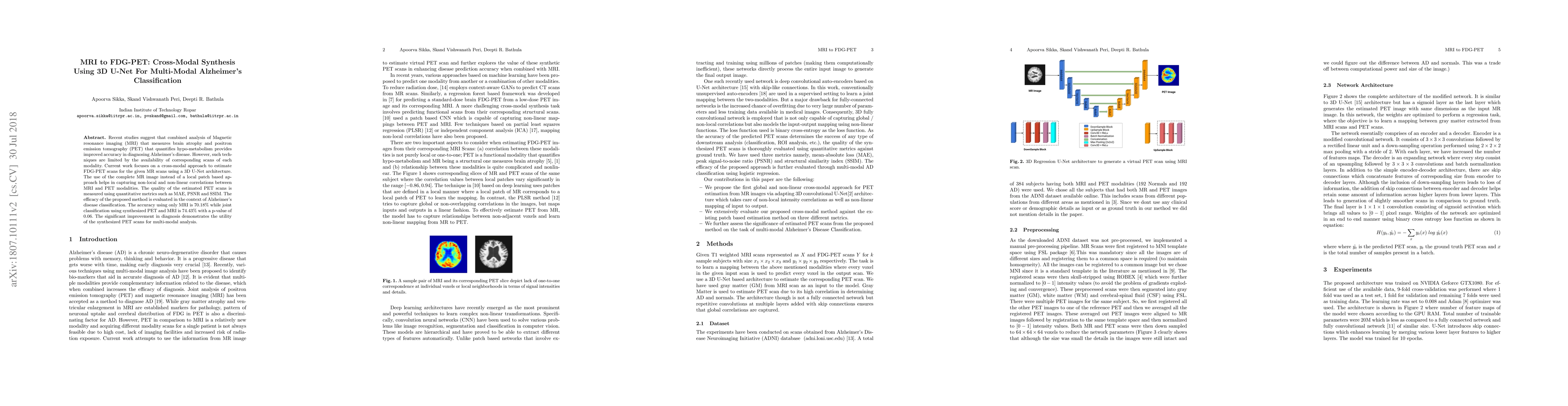 This paper proposes a 3D U-Net architecture for synthesizing FDG-PET scans from MRI data to improve Alzheimer's disease diagnosis. The synthesized PET scans, evaluated using MAE, PSNR, and SSIM, enhance classification accuracy from 70.18% using MRI alone to 74.43% when combined with synthesized PET.