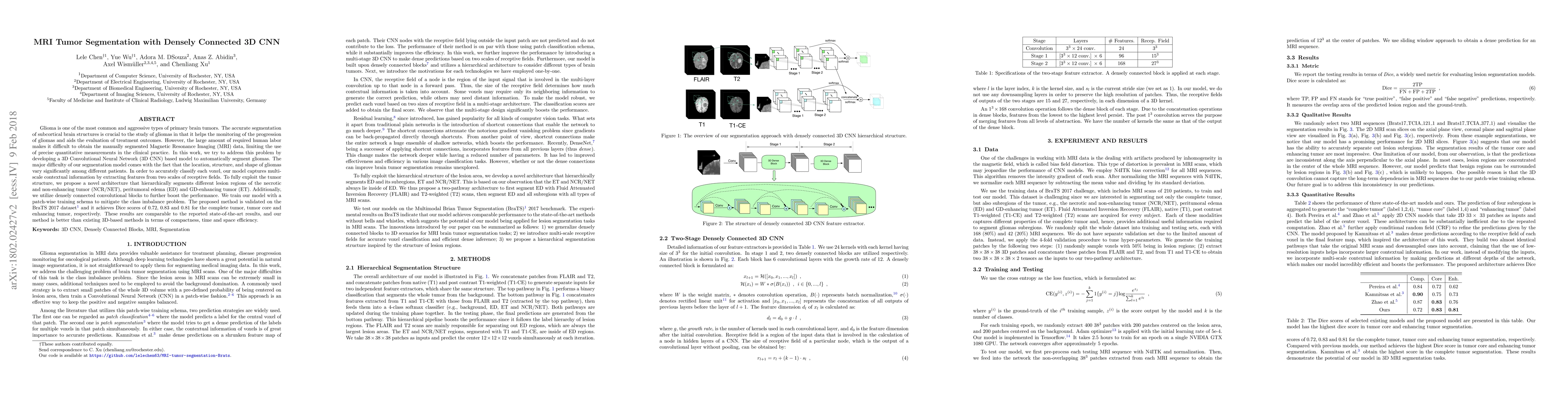 Glioma is one of the most common and aggressive types of primary brain tumors. The accurate segmentation of subcortical brain structures is crucial to the study of gliomas in that it helps the monitoring of the progression of gliomas and aids the evaluation of treatment outcomes. However, the large amount of required human labor makes it difficult to obtain the manually segmented Magnetic Resonance Imaging (MRI) data, limiting the use of precise quantitative measurements in the clinical practice. In this work, we try to address this problem by developing a 3D Convolutional Neural Network~(3D CNN) based model to automatically segment gliomas. The major difficulty of our segmentation model comes with the fact that the location, structure, and shape of gliomas vary significantly among different patients. In order to accurately classify each voxel, our model captures multi-scale contextual information by extracting features from two scales of receptive fields. To fully exploit the tumor structure, we propose a novel architecture that hierarchically segments different lesion regions of the necrotic and non-enhancing tumor~(NCR/NET), peritumoral edema~(ED) and GD-enhancing tumor~(ET). Additionally, we utilize densely connected convolutional blocks to further boost the performance. We train our model with a patch-wise training schema to mitigate the class imbalance problem. The proposed method is validated on the BraTS 2017 dataset and it achieves Dice scores of 0.72, 0.83 and 0.81 for the complete tumor, tumor core and enhancing tumor, respectively. These results are comparable to the reported state-of-the-art results, and our method is better than existing 3D-based methods in terms of compactness, time and space efficiency.