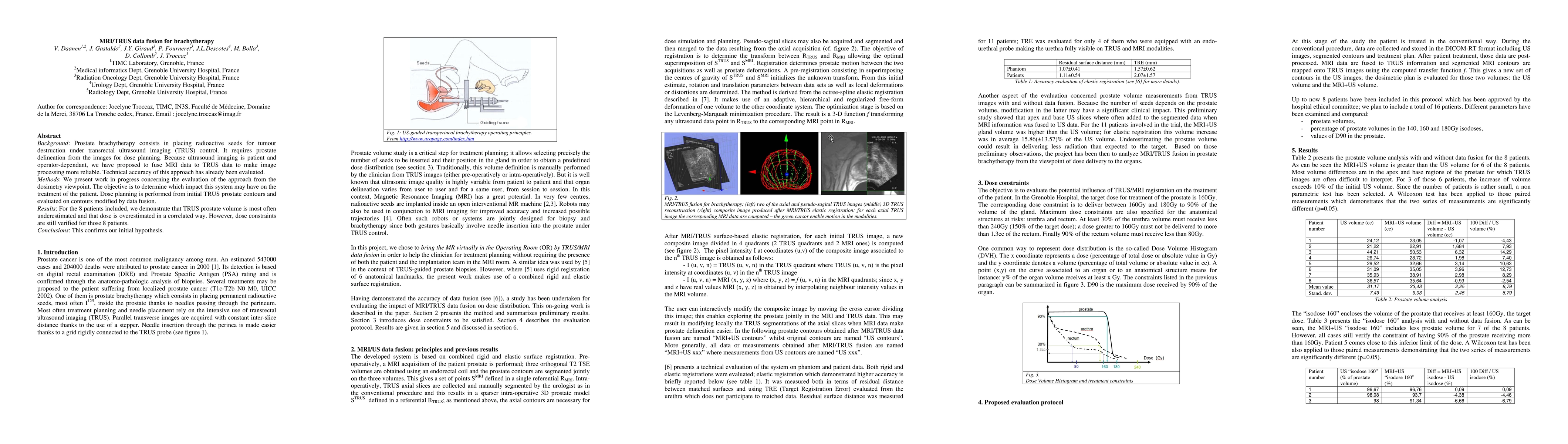 BACKGROUND: Prostate brachytherapy consists in placing radioactive seeds for tumour destruction under transrectal ultrasound imaging (TRUS) control. It requires prostate delineation from the images for dose planning. Because ultrasound imaging is patient- and operator-dependent, we have proposed to fuse MRI data to TRUS data to make image processing more reliable. The technical accuracy of this approach has already been evaluated. METHODS: We present work in progress concerning the evaluation of the approach from the dosimetry viewpoint. The objective is to determine what impact this system may have on the treatment of the patient. Dose planning is performed from initial TRUS prostate contours and evaluated on contours modified by data fusion. RESULTS: For the eight patients included, we demonstrate that TRUS prostate volume is most often underestimated and that dose is overestimated in a correlated way. However, dose constraints are still verified for those eight patients. CONCLUSIONS: This confirms our initial hypothesis.