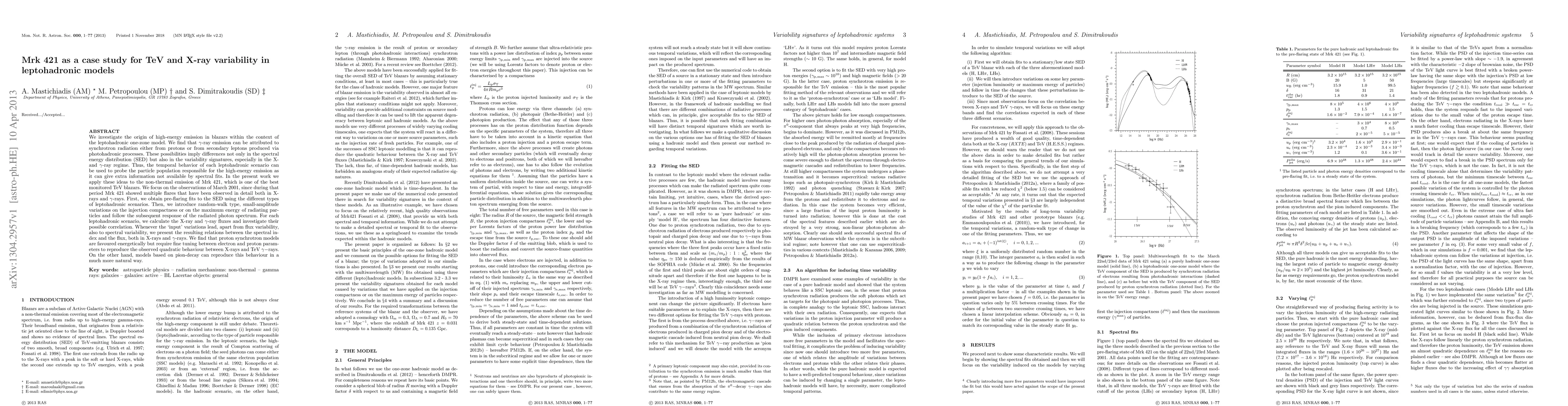 We investigate the origin of high-energy emission in blazars within the context of the leptohadronic one-zone model. We find that $\gamma$-ray emission can be attributed to synchrotron radiation either from protons or from secondary leptons produced via photohadronic processes. These possibilities imply differences not only in the spectral energy distribution (SED) but also in the variability signatures, especially in the X- and $\gamma$-ray regime. Thus, the temporal behavior of each leptohadronic scenario can be used to probe the particle population responsible for the high-energy emission as it can give extra information not available by spectral fits. In the present work we apply these ideas to the non-thermal emission of Mrk 421. We focus on the observations of March 2001, since during that period Mrk 421 showed multiple flares that have been observed in detail both in X-rays and $\gamma$-rays. First, we obtain pre-flaring fits to the SED using the different types of leptohadronic scenarios. Then, we introduce random-walk type, small-amplitude variations on the injection compactness or on the maximum energy of radiating particles and follow the subsequent response of the radiated photon spectrum. For each leptohadronic scenario, we calculate the X-ray and $\gamma$-ray fluxes and investigate their possible correlation. Whenever the `input' variations lead, apart from flux variability, also to spectral variability, we present the resulting relations between the spectral index and the flux, both in X-rays and $\gamma$-rays. We find that proton synchrotron models are favoured energetically but require fine tuning between electron and proton parameters to reproduce the observed quadratic behaviour between X-rays and TeV $\gamma-$rays. On the other hand, models based on pion-decay can reproduce this behaviour in a much more natural way.