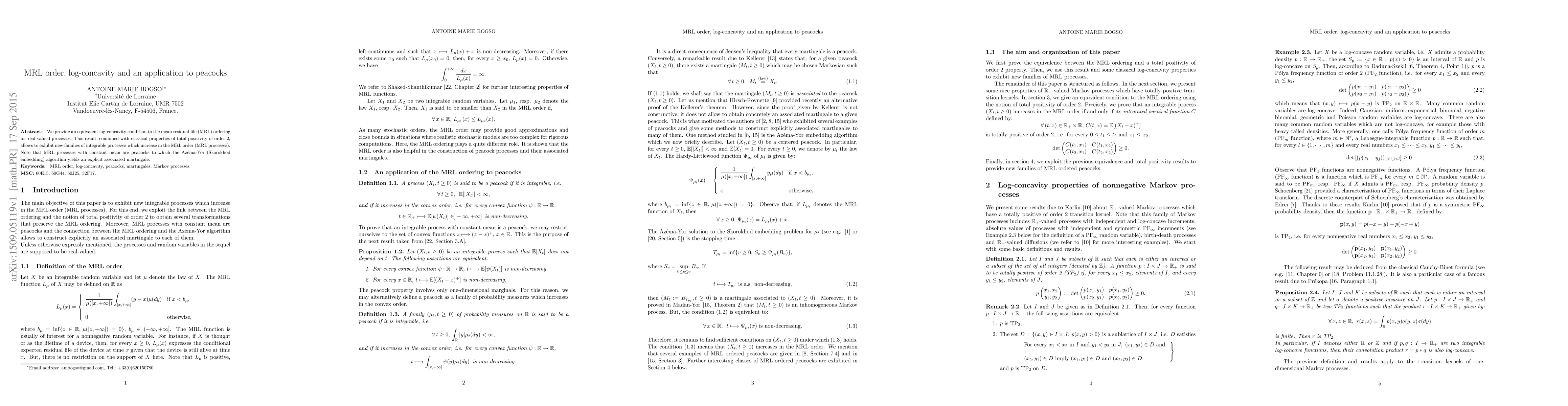 Summary: The paper establishes an equivalent log-concavity condition for the mean residual life (MRL) ordering of real-valued processes and identifies new families of MRL processes that increase in MRL order. It also connects MRL processes with constant mean, termed peacocks, to the Az\'ema-Yor algorithm for generating associated martingales.