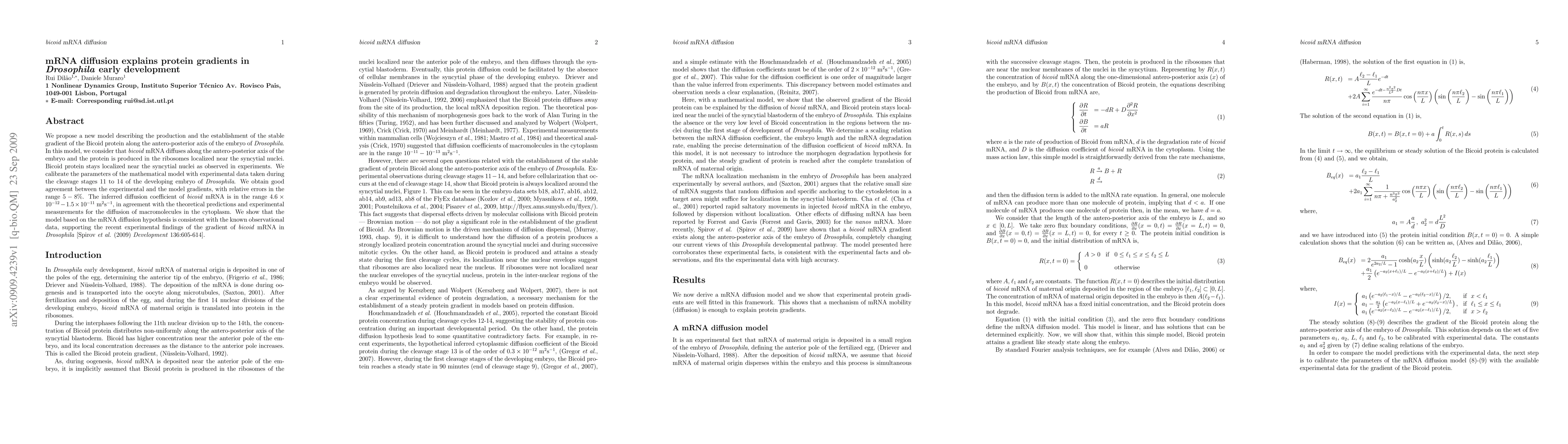 This paper proposes a model explaining the stable gradient of the Bicoid protein in \textit{Drosophila} embryos through mRNA diffusion along the antero-posterior axis. The model aligns well with experimental data, showing the mRNA's diffusion coefficient is consistent with theoretical predictions.