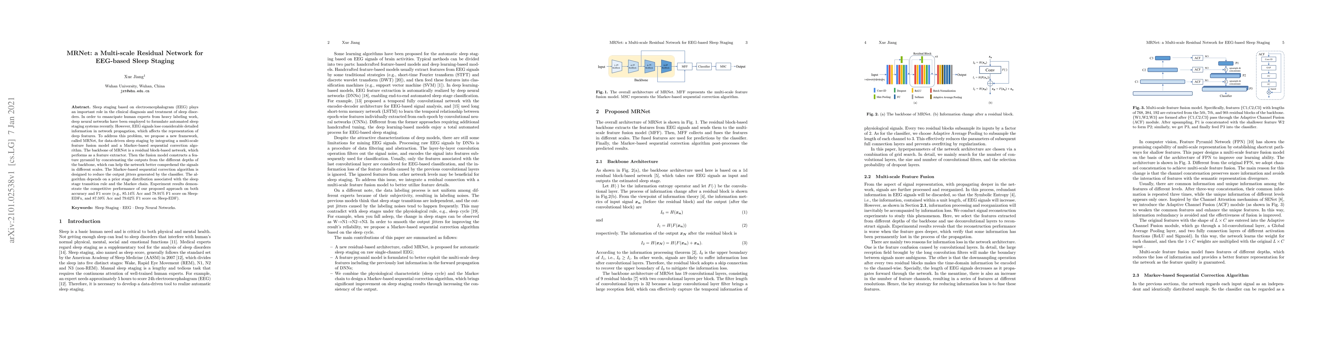 MRNet is a multi-scale residual network designed for automated EEG-based sleep staging, integrating feature fusion and Markov-based sequential correction to enhance feature representation and reduce classifier jitters, achieving high accuracy and F1 scores.