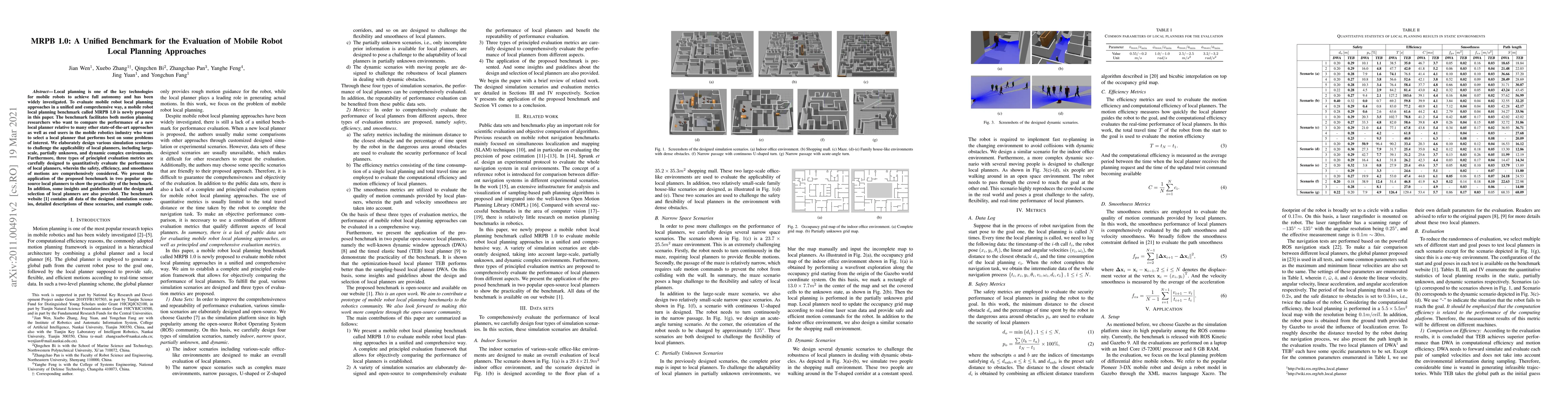 Local planning is one of the key technologies for mobile robots to achieve full autonomy and has been widely investigated. To evaluate mobile robot local planning approaches in a unified and comprehensive way, a mobile robot local planning benchmark called MRPB 1.0 is newly proposed in this paper. The benchmark facilitates both motion planning researchers who want to compare the performance of a new local planner relative to many other state-of-the-art approaches as well as end users in the mobile robotics industry who want to select a local planner that performs best on some problems of interest. We elaborately design various simulation scenarios to challenge the applicability of local planners, including large-scale, partially unknown, and dynamic complex environments. Furthermore, three types of principled evaluation metrics are carefully designed to quantitatively evaluate the performance of local planners, wherein the safety, efficiency, and smoothness of motions are comprehensively considered. We present the application of the proposed benchmark in two popular open-source local planners to show the practicality of the benchmark. In addition, some insights and guidelines about the design and selection of local planners are also provided. The benchmark website contains all data of the designed simulation scenarios, detailed descriptions of these scenarios, and example code.