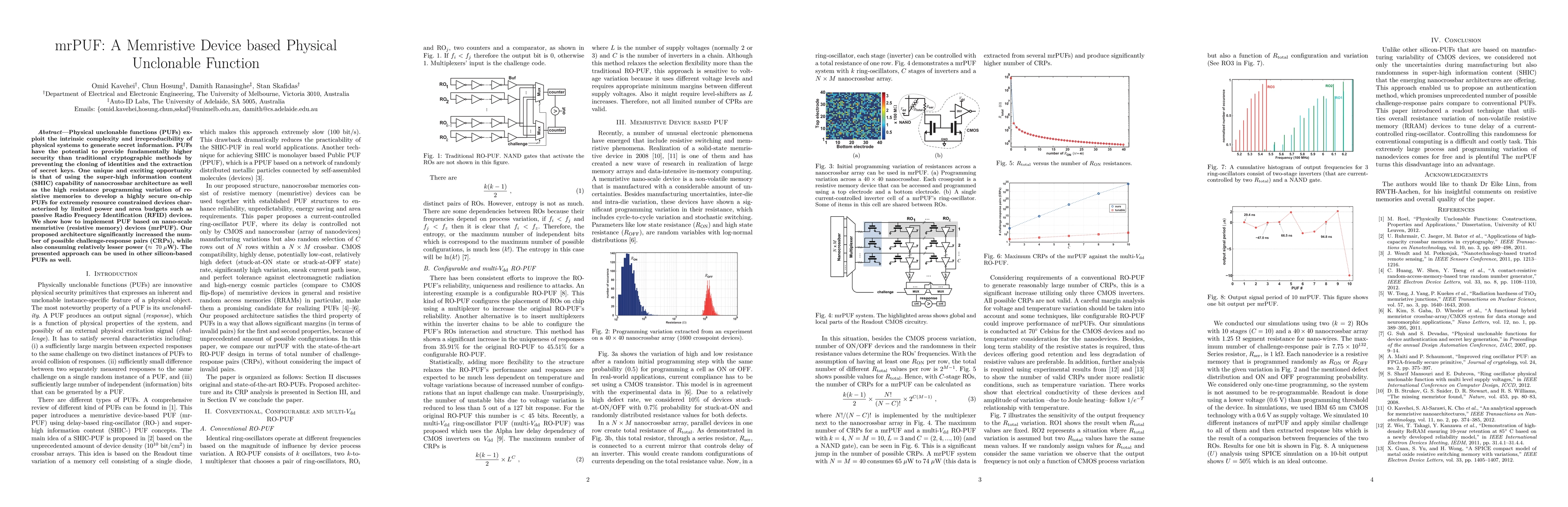 This paper proposes mrPUF, a memristive device-based physical unclonable function (PUF) leveraging nanocrossbar architecture and resistive memories for secure, low-power identity verification in resource-constrained devices like RFID tags. The architecture enhances the number of challenge-response pairs while consuming minimal power.