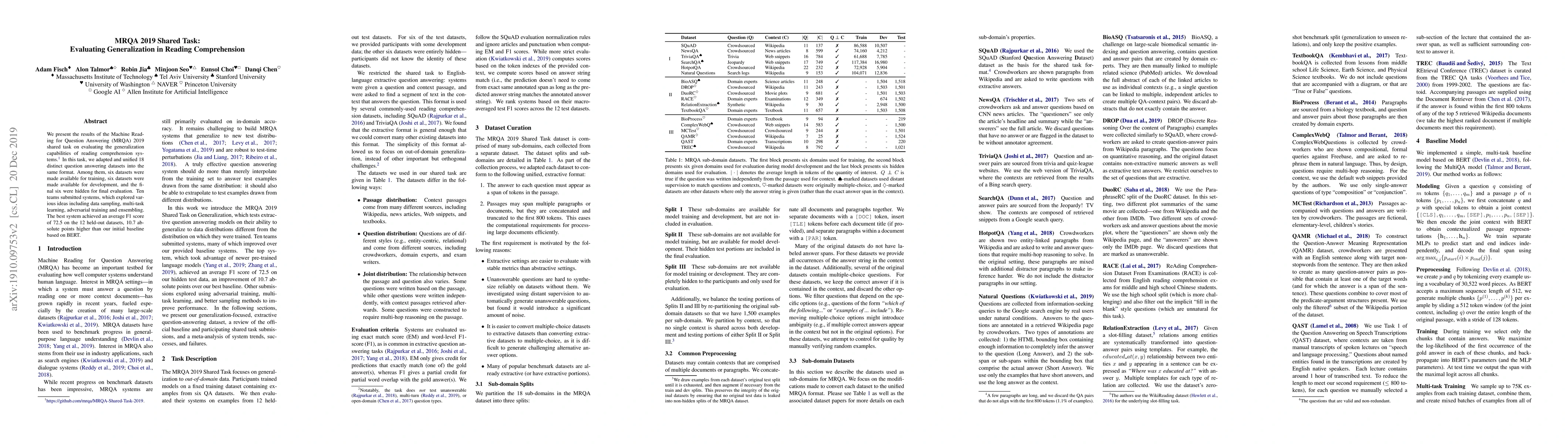 A machine learning competition evaluated reading comprehension systems' ability to generalize across different datasets, with the top system achieving an average F1 score of 72.5.