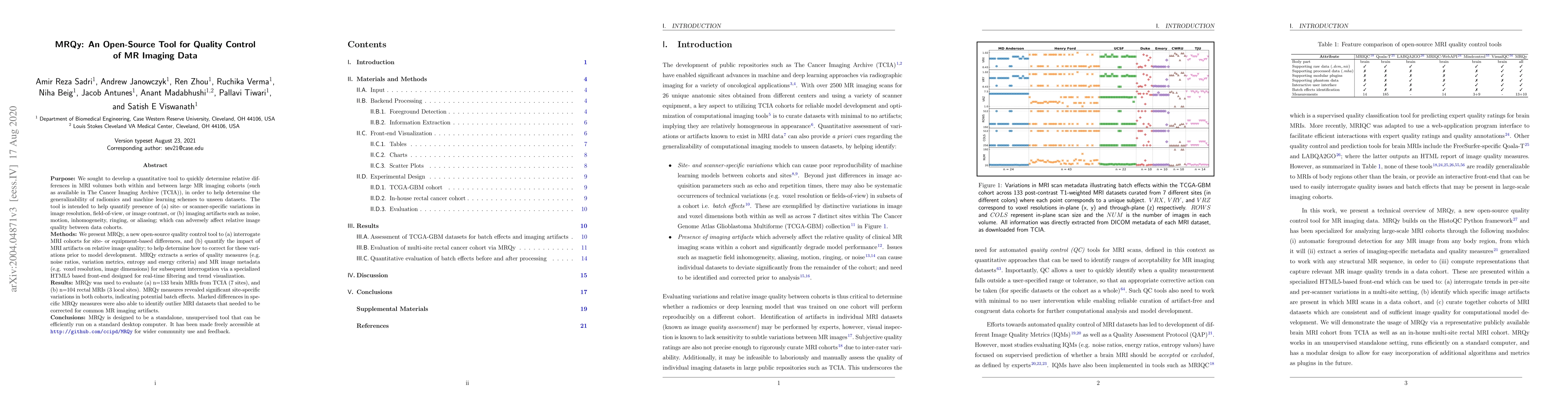We sought to develop a quantitative tool to quickly determine relative differences in MRI volumes both within and between large MR imaging cohorts (such as available in The Cancer Imaging Archive (TCIA)), in order to help determine the generalizability of radiomics and machine learning schemes to unseen datasets. The tool is intended to help quantify presence of (a) site- or scanner-specific variations in image resolution, field-of-view, or image contrast, or (b) imaging artifacts such as noise, motion, inhomogeneity, ringing, or aliasing; which can adversely affect relative image quality between data cohorts. We present MRQy, a new open-source quality control tool to (a) interrogate MRI cohorts for site- or equipment-based differences, and (b) quantify the impact of MRI artifacts on relative image quality; to help determine how to correct for these variations prior to model development. MRQy extracts a series of quality measures (e.g. noise ratios, variation metrics, entropy and energy criteria) and MR image metadata (e.g. voxel resolution, image dimensions) for subsequent interrogation via a specialized HTML5 based front-end designed for real-time filtering and trend visualization. MRQy was used to evaluate (a) n=133 brain MRIs from TCIA (7 sites), and (b) n=104 rectal MRIs (3 local sites). MRQy measures revealed significant site-specific variations in both cohorts, indicating potential batch effects. Marked differences in specific MRQy measures were also able to identify outlier MRI datasets that needed to be corrected for common MR imaging artifacts. MRQy is designed to be a standalone, unsupervised tool that can be efficiently run on a standard desktop computer. It has been made freely accessible at \url{http://github.com/ccipd/MRQy} for wider community use and feedback.