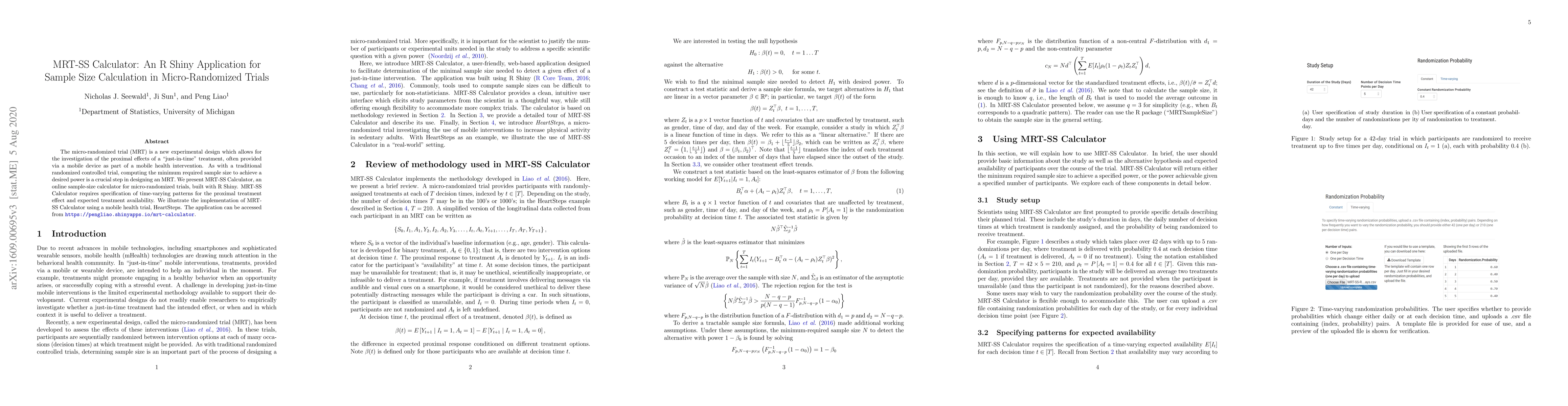 The MRT-SS Calculator is an R Shiny application designed to compute the minimum required sample size for micro-randomized trials, allowing for the analysis of "just-in-time" treatments. It requires input on time-varying treatment effects and availability, demonstrated through a mobile health trial example.
