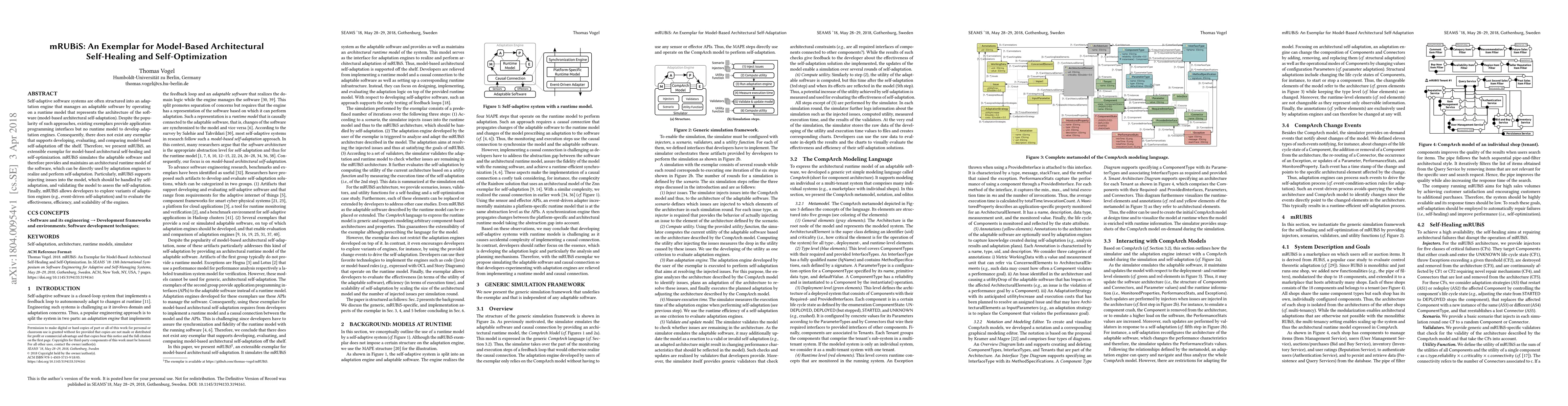 mRUBiS is an extensible exemplar for model-based architectural self-healing and self-optimization, providing a runtime model for adaptable software and enabling the development and evaluation of self-adaptation engines. It supports injecting issues and validating the model to assess self-adaptation, allowing developers to explore and evaluate different adaptation strategies.