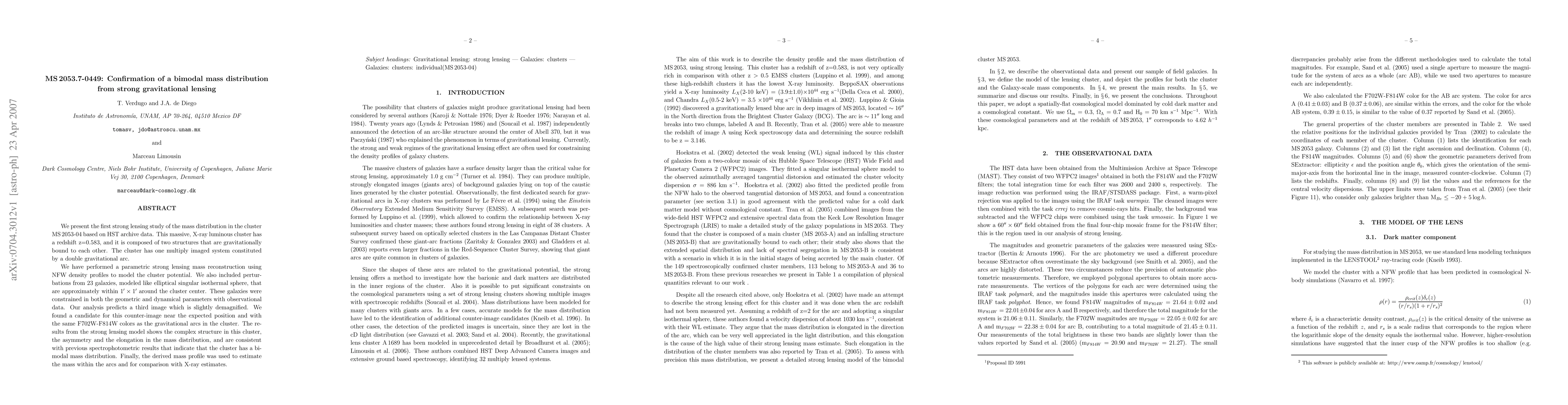 We present the first strong lensing study of the mass distribution in the cluster MS 2053-04 based on HST archive data. This massive, X-ray luminous cluster has a redshift z=0.583, and it is composed of two structures that are gravitationally bound to each other. The cluster has one multiply imaged system constituted by a double gravitational arc. We have performed a parametric strong lensing mass reconstruction using NFW density profiles to model the cluster potential. We also included perturbations from 23 galaxies, modeled like elliptical singular isothermal sphere, that are approximately within 1'x1' around the cluster center. These galaxies were constrained in both the geometric and dynamical parameters with observational data. Our analysis predicts a third image which is slightly demagnified. We found a candidate for this counter-image near the expected position and with the same F702W-F814W colors as the gravitational arcs in the cluster. The results from the strong lensing model shows the complex structure in this cluster, the asymmetry and the elongation in the mass distribution, and are consistent with previous spectrophotometric results that indicate that the cluster has a bimodal mass distribution. Finally, the derived mass profile was used to estimate the mass within the arcs and for comparison with X-ray estimates.