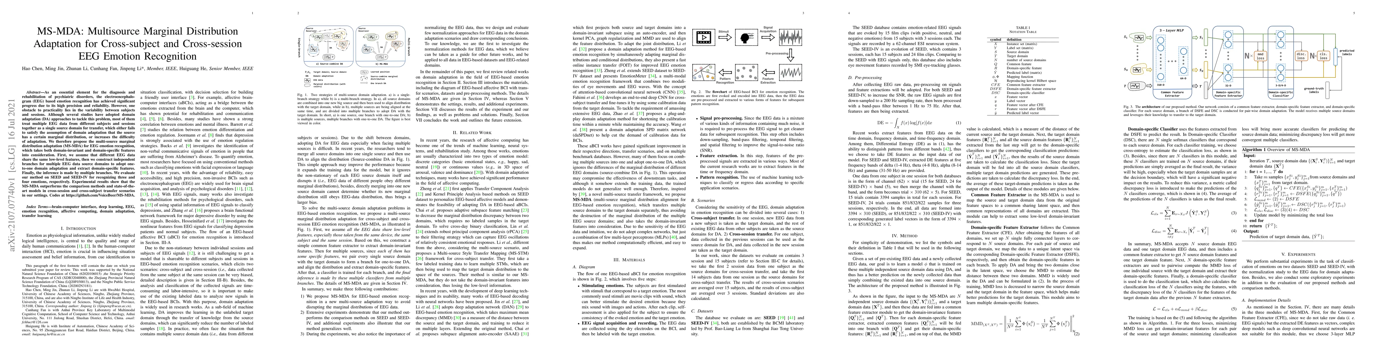 The MS-MDA method proposes a multisource marginal distribution adaptation approach for EEG-based emotion recognition, addressing variability between subjects and sessions. It employs independent branches for domain-specific feature extraction and outperforms existing methods in cross-subject and cross-session emotion recognition tasks.
