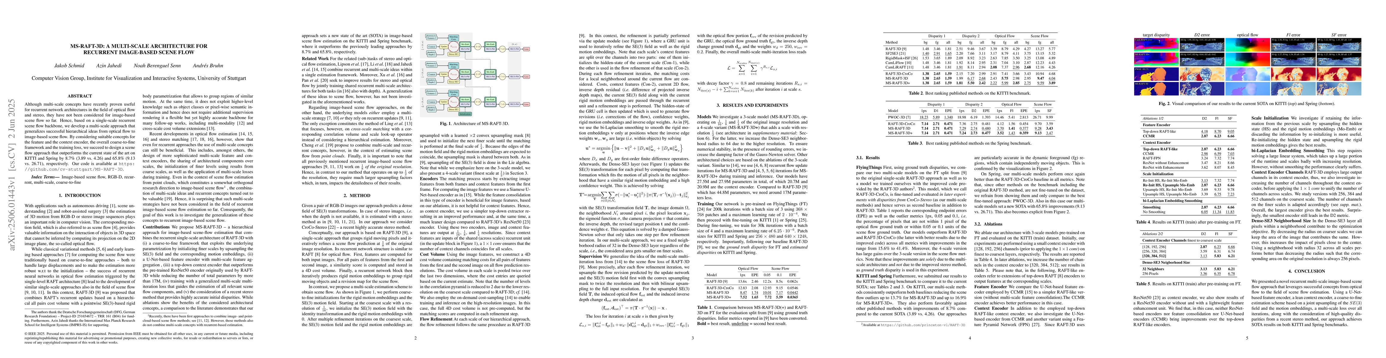 The paper introduces MS-RAFT-3D, a multi-scale recurrent architecture for image-based scene flow, which outperforms existing methods on KITTI and Spring benchmarks by 8.7% and 65.8% respectively. The method generalizes hierarchical concepts from optical flow to scene flow.