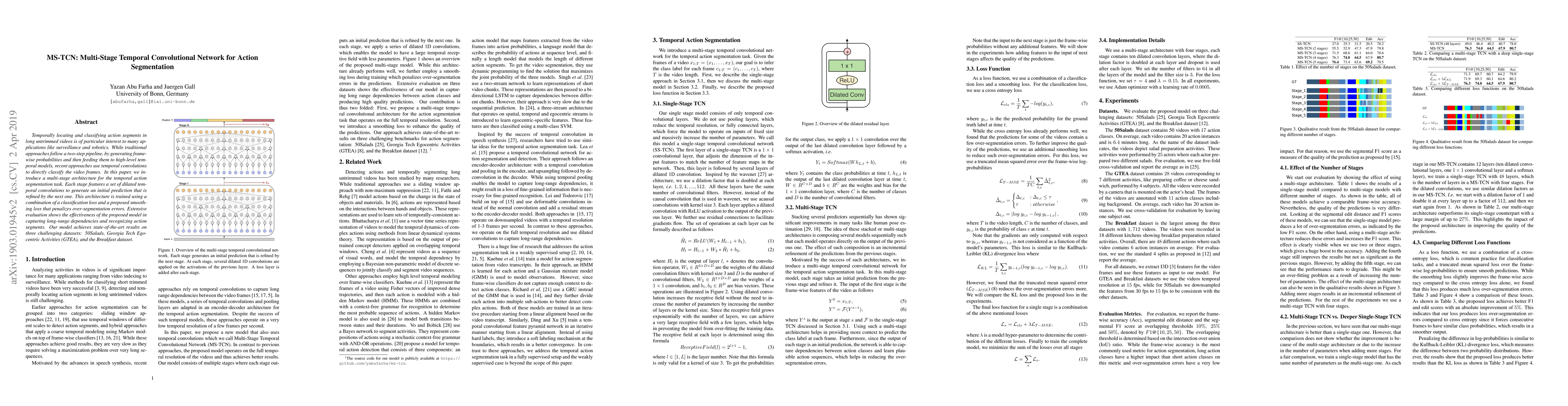 Temporally locating and classifying action segments in long untrimmed videos is of particular interest to many applications like surveillance and robotics. While traditional approaches follow a two-step pipeline, by generating frame-wise probabilities and then feeding them to high-level temporal models, recent approaches use temporal convolutions to directly classify the video frames. In this paper, we introduce a multi-stage architecture for the temporal action segmentation task. Each stage features a set of dilated temporal convolutions to generate an initial prediction that is refined by the next one. This architecture is trained using a combination of a classification loss and a proposed smoothing loss that penalizes over-segmentation errors. Extensive evaluation shows the effectiveness of the proposed model in capturing long-range dependencies and recognizing action segments. Our model achieves state-of-the-art results on three challenging datasets: 50Salads, Georgia Tech Egocentric Activities (GTEA), and the Breakfast dataset.