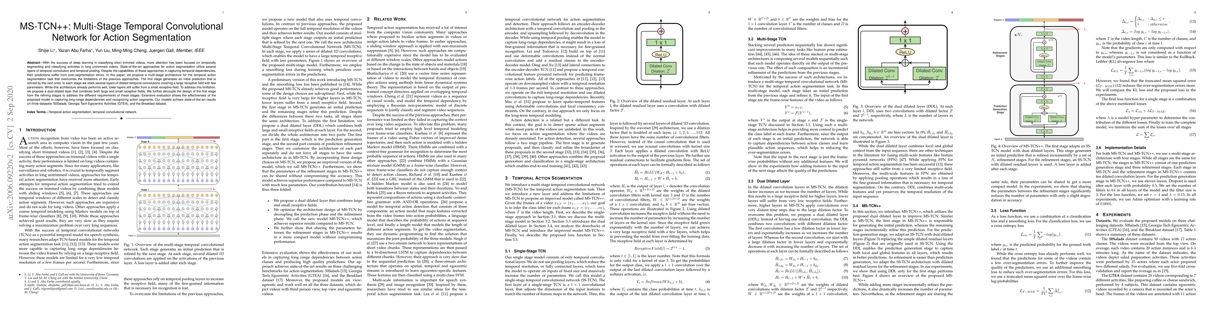 The paper proposes a multi-stage temporal convolutional network (MS-TCN++) for action segmentation in long untrimmed videos, addressing over-segmentation errors through a dual dilated layer and decoupled stage design. The model achieves state-of-the-art results on three datasets by capturing long-range dependencies and refining initial predictions.