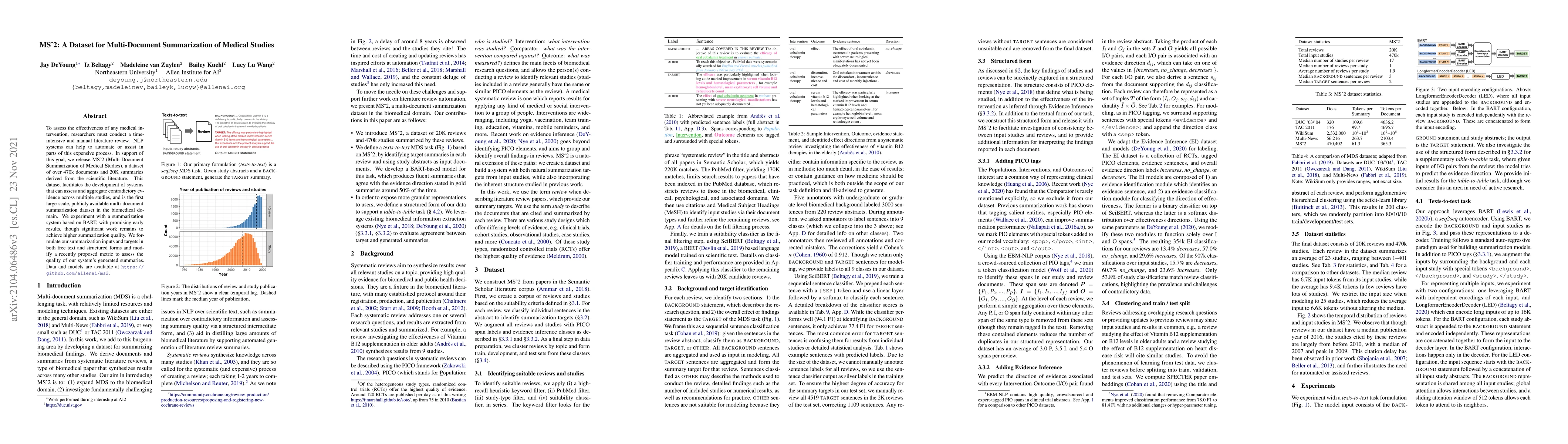 The MS2 dataset offers over 470k documents and 20k summaries from medical literature to aid in the development of NLP systems for multi-document summarization, with initial promising results from a BART-based summarization system. The dataset and models are publicly available for further research.