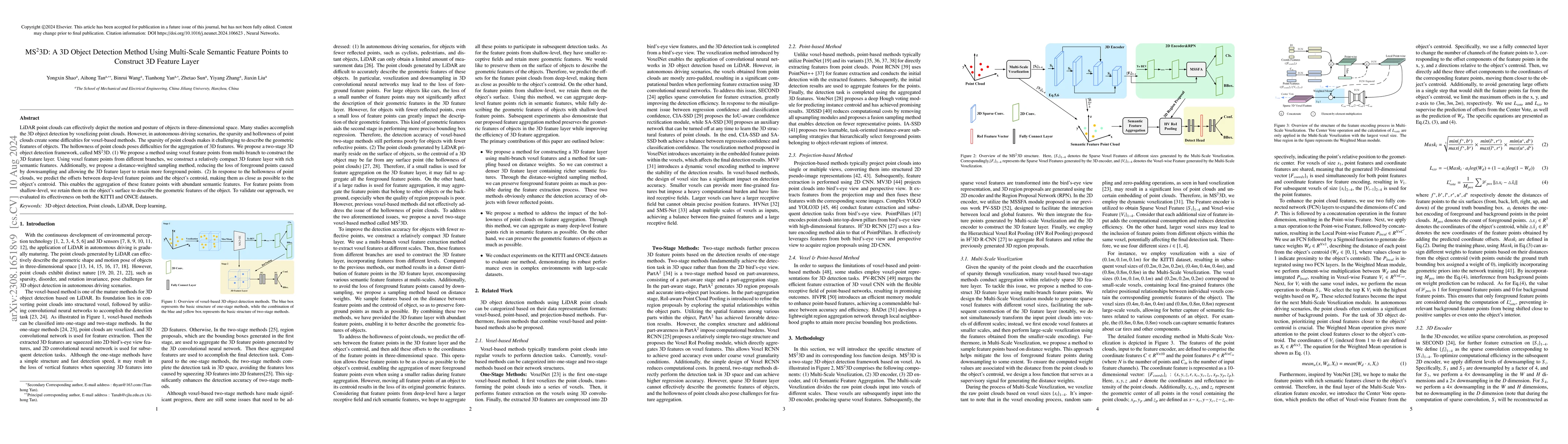 MS23D is a two-stage 3D object detection method that constructs a 3D feature layer using multi-scale semantic feature points, addressing the sparsity and hollowness of LiDAR point clouds. It employs a distance-weighted sampling method and predicts offsets to aggregate features, validated on KITTI and ONCE datasets.
