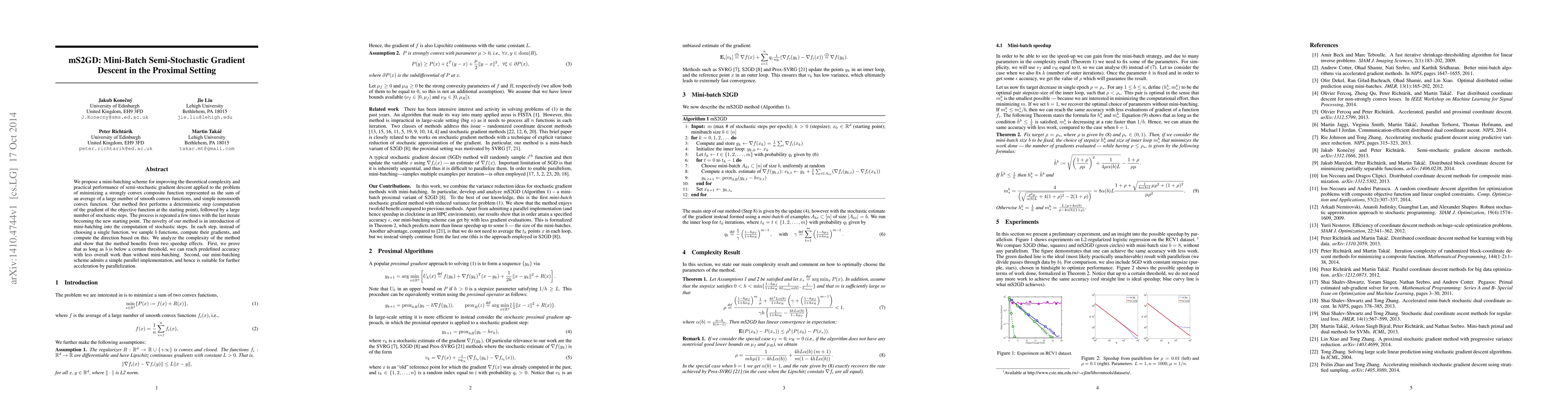 This paper proposes mS2GD, a mini-batch semi-stochastic gradient descent method for minimizing strongly convex composite functions, which combines deterministic and stochastic steps. The method introduces mini-batching to stochastic gradient computations, achieving both theoretical efficiency and practical speedup through parallelization.