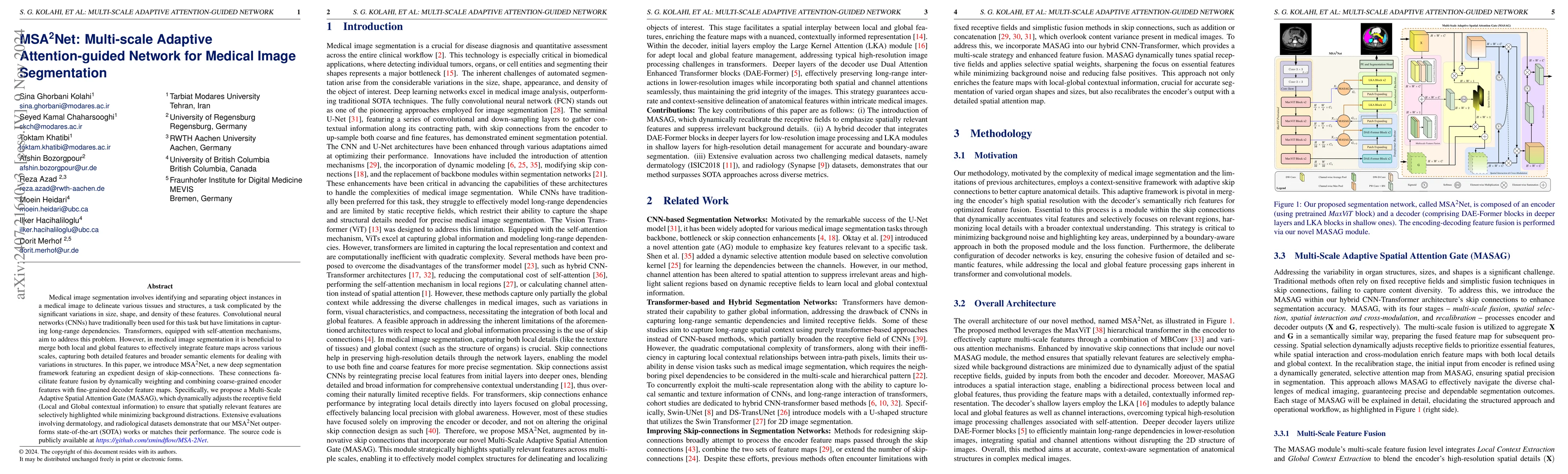 MSA2Net presents a novel deep segmentation framework that merges CNNs with Transformer-based self-attention mechanisms to enhance medical image segmentation by capturing both local and global features through adaptive spatial attention. The proposed Multi-Scale Adaptive Spatial Attention Gate dynamically adjusts the receptive field to highlight relevant features while minimizing distractions, outperforming or matching state-of-the-art methods in evaluations.