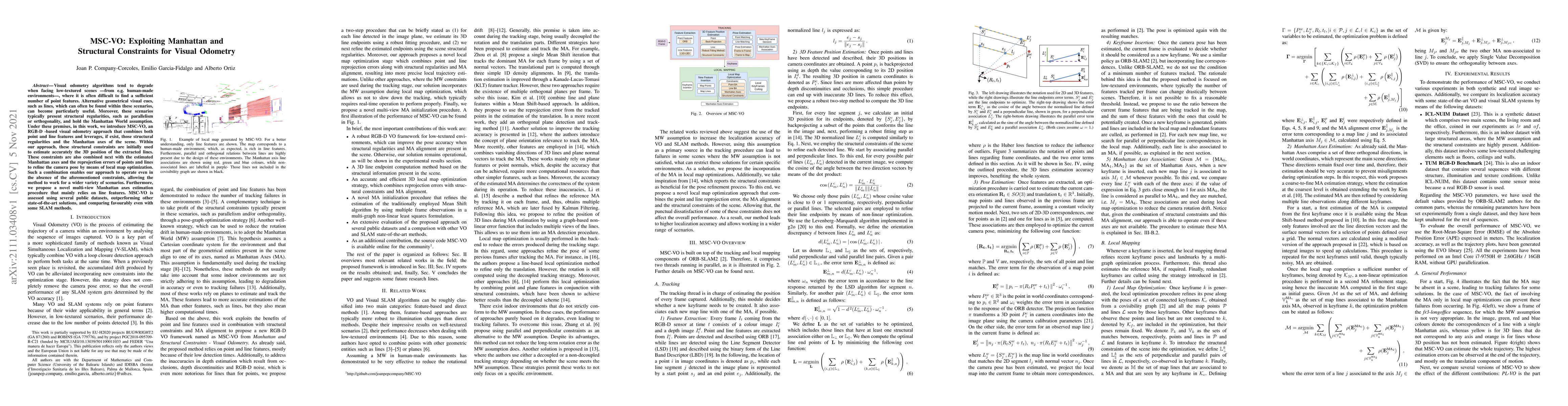 MSC-VO is an RGB-D visual odometry method that integrates point and line features, leveraging structural regularities and the Manhattan World assumption to enhance performance in low-textured environments. It outperforms other state-of-the-art solutions by combining structural constraints and Manhattan axes for refined pose estimation.