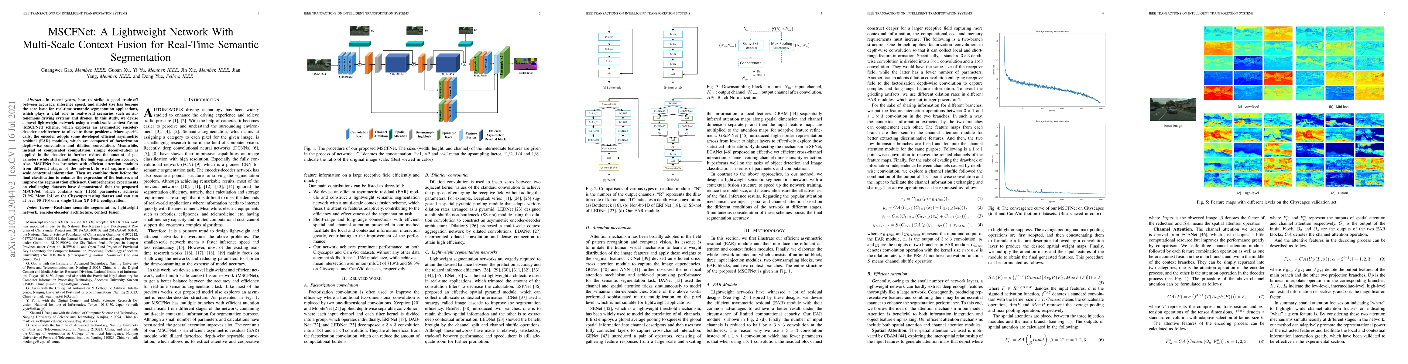 MSCFNet is a lightweight network designed for real-time semantic segmentation, utilizing multi-scale context fusion and efficient asymmetric residual modules to balance accuracy and speed. It achieves 71.9% Mean IoU on Cityscapes and operates at over 50 FPS on a single GPU.