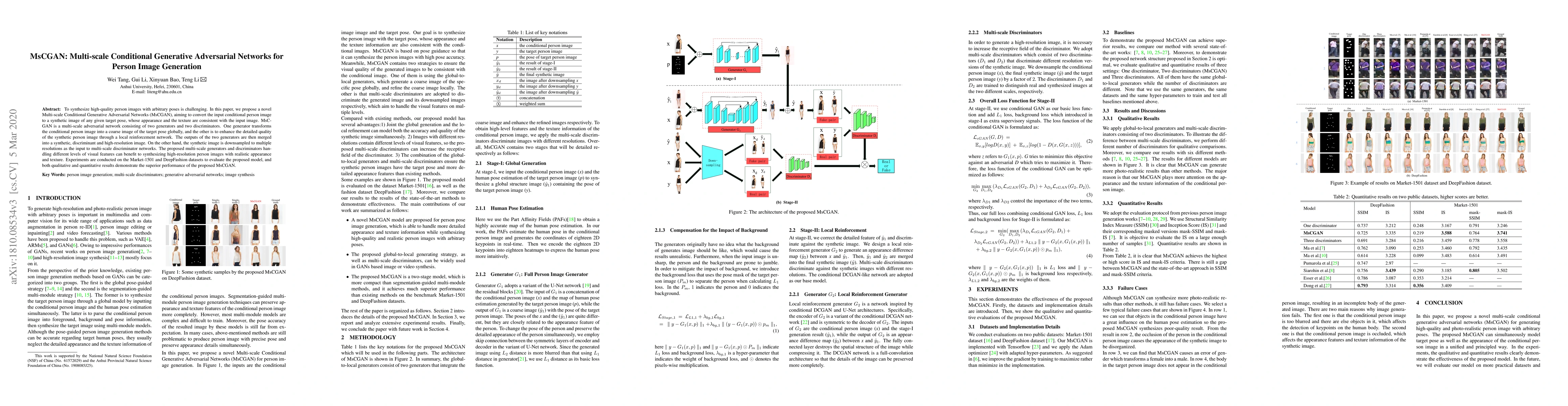 The paper introduces MsCGAN, a multi-scale conditional Generative Adversarial Network for generating high-quality person images in arbitrary poses, combining global and local generators to produce realistic and detailed synthetic images. Experiments on Market-1501 and DeepFashion datasets show MsCGAN's superior performance in generating high-resolution images with consistent appearance and texture.