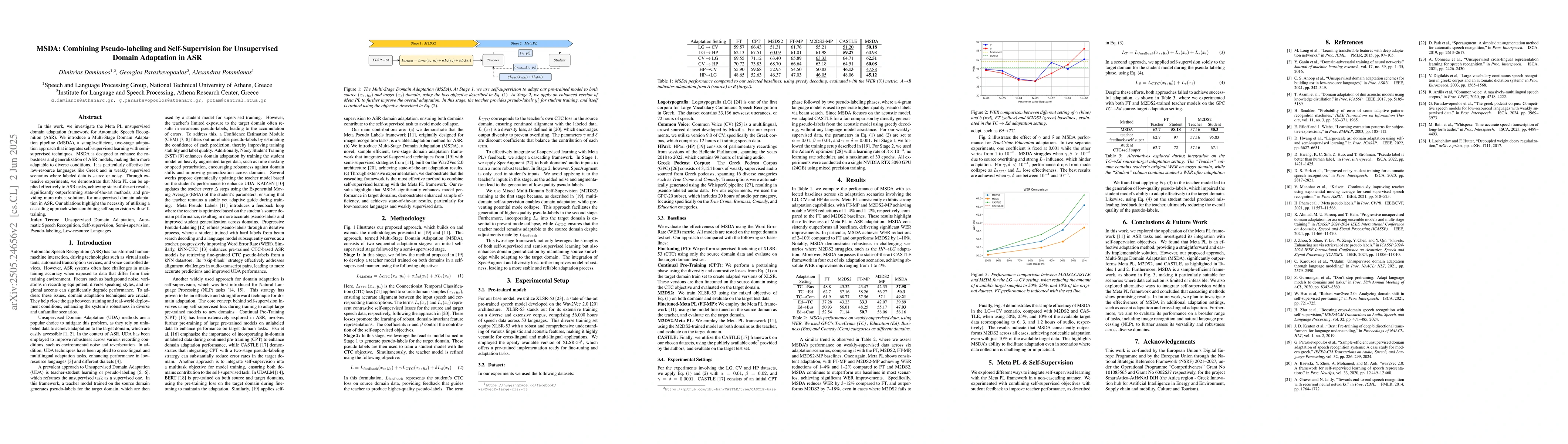 In this work, we investigate the Meta PL unsupervised domain adaptation framework for Automatic Speech Recognition (ASR). We introduce a Multi-Stage Domain Adaptation pipeline (MSDA), a sample-efficient, two-stage adaptation approach that integrates self-supervised learning with semi-supervised techniques. MSDA is designed to enhance the robustness and generalization of ASR models, making them more adaptable to diverse conditions. It is particularly effective for low-resource languages like Greek and in weakly supervised scenarios where labeled data is scarce or noisy. Through extensive experiments, we demonstrate that Meta PL can be applied effectively to ASR tasks, achieving state-of-the-art results, significantly outperforming state-of-the-art methods, and providing more robust solutions for unsupervised domain adaptation in ASR. Our ablations highlight the necessity of utilizing a cascading approach when combining self-supervision with self-training.