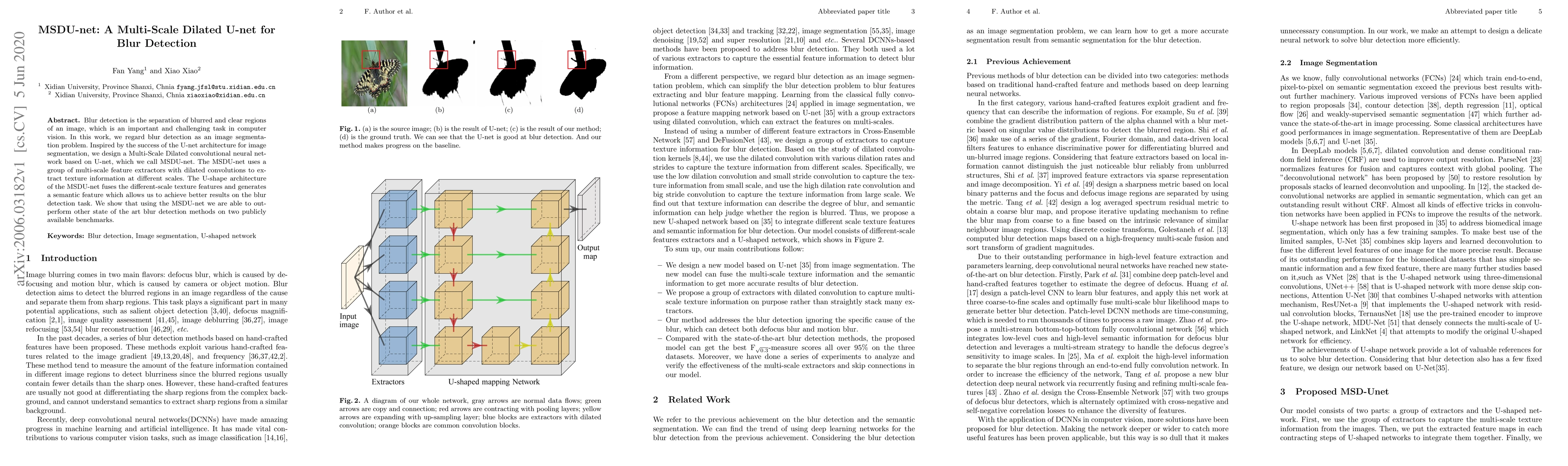 MSDU-net is a Multi-Scale Dilated U-net designed for blur detection in images, treating it as an image segmentation problem. It outperforms other methods by combining multi-scale feature extractors and dilated convolutions to capture texture information at various scales, achieving better blur detection results on benchmark datasets.