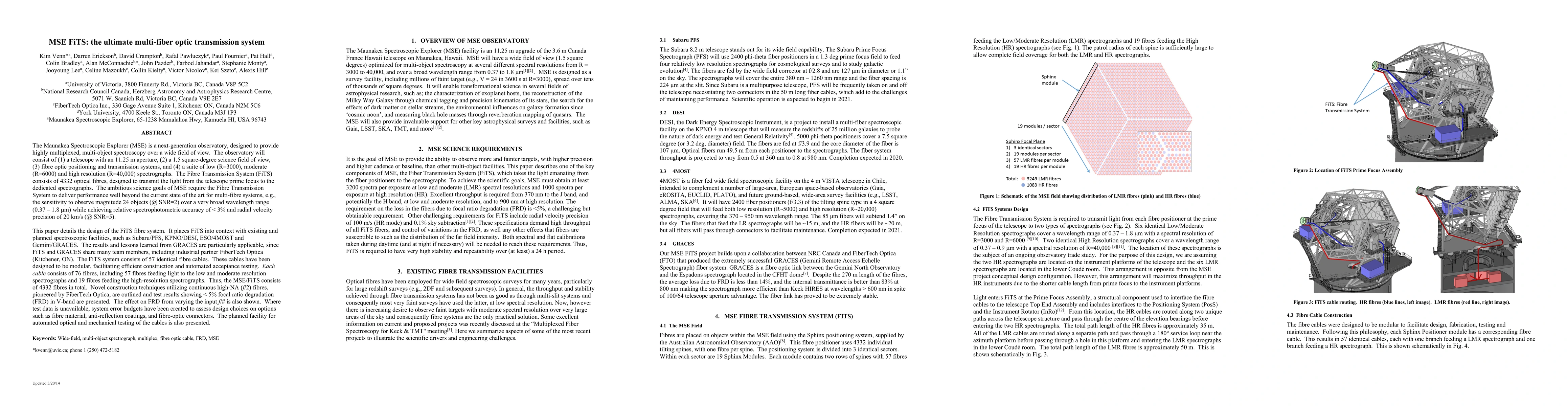 The Maunakea Spectroscopic Explorer (MSE) employs a multi-fibre optic transmission system with 4332 fibres to deliver light from its 11.25 m telescope to various spectrographs for high-resolution spectroscopy, aiming to achieve unprecedented sensitivity and accuracy for observing faint objects. The system is designed to meet ambitious scientific goals, including observing magnitude 24 objects across a broad wavelength range with <3% spectrophotometric accuracy and 20 km/s radial velocity precision.