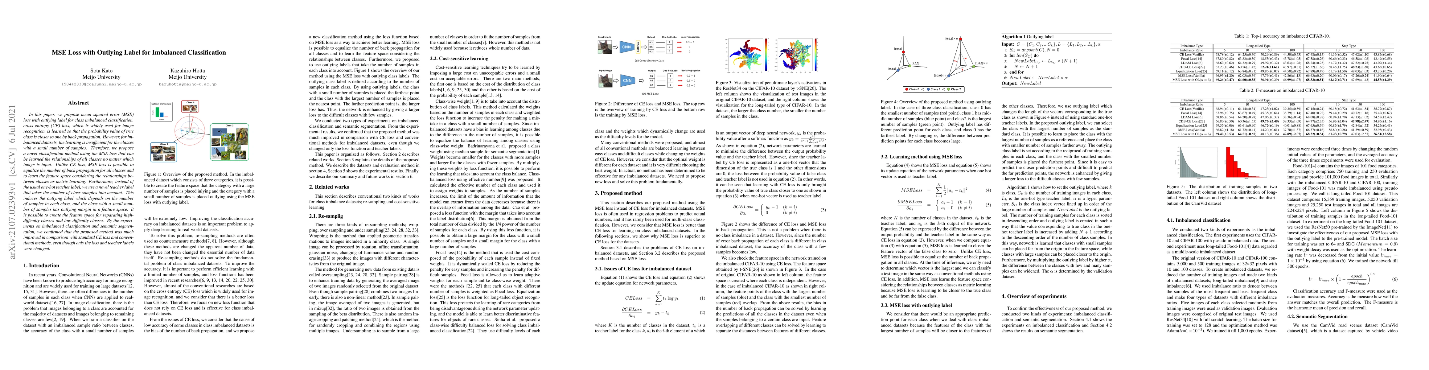 This paper proposes a novel MSE loss with an outlying label to address class imbalance in classification tasks. Unlike cross entropy loss, MSE loss equalizes back propagation for all classes and incorporates metric learning to better learn inter-class relationships, leading to improved performance in imbalanced datasets.