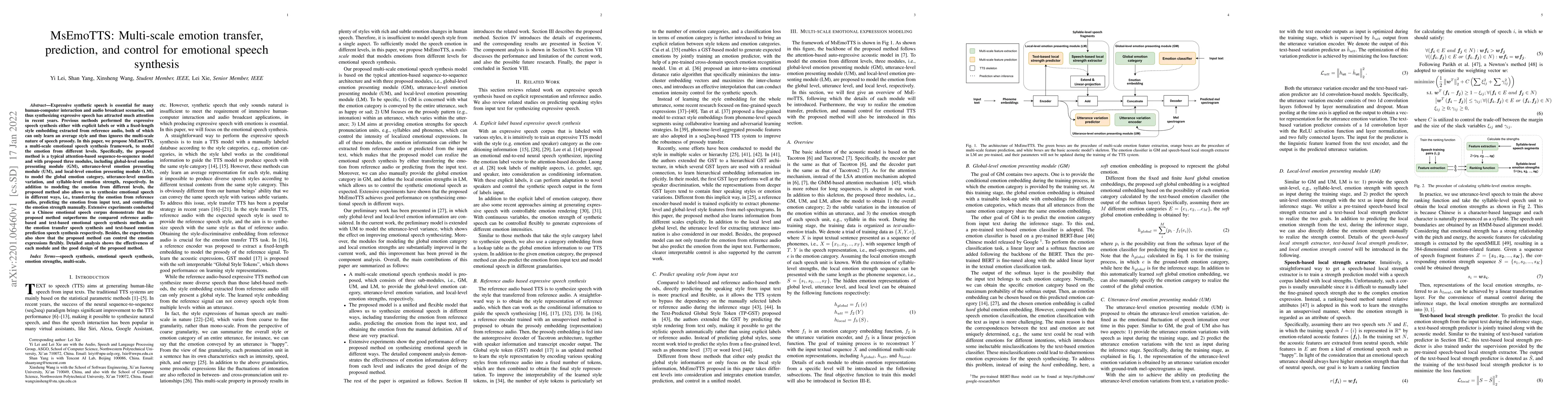 The paper introduces MsEmoTTS, a multi-scale framework for emotional speech synthesis that models emotion at global, utterance, and local levels. The method outperforms existing approaches in emotion transfer and prediction, and allows flexible emotion strength control.